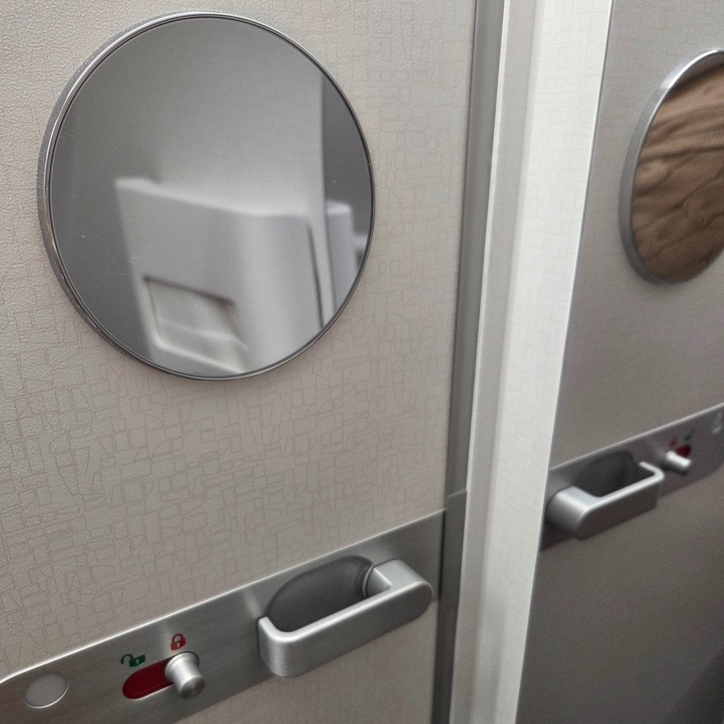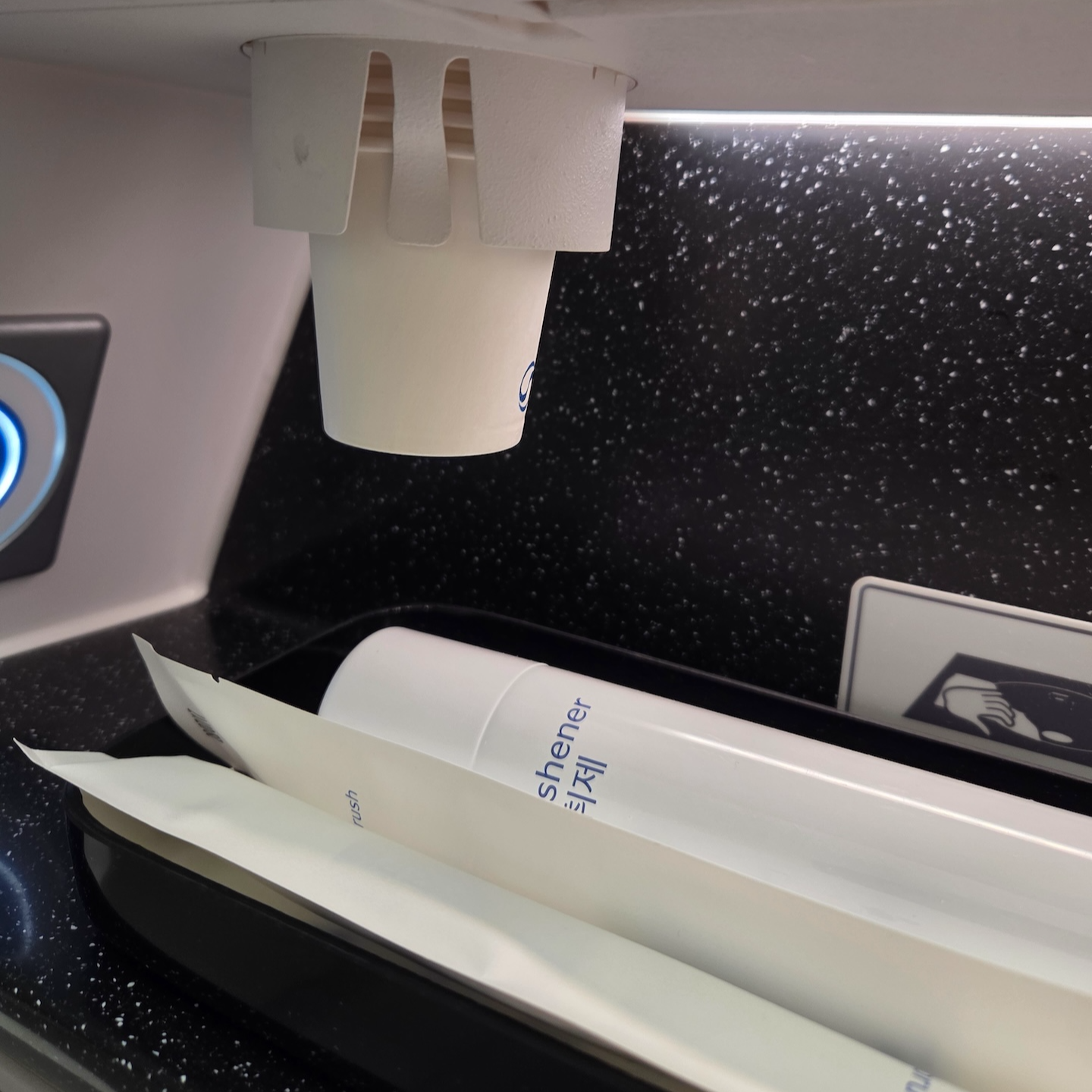 대한항공 A321neo 프레스티지 클래스 화장실 어매니티 화장실은 기내 앞쪽의 프레스티지 전용 화장실을 이용했습니다. 공간 자체는 여느 단거리 기종처럼 협소했지만, 도입된 지 얼마 되지 않은 기재답게 관리 상태는 매우 청결했습니다. 기저귀 교환대가 설치되어 있고, 문에 원형 거울이 별도로 배치되어 있는 세심한 설계가 인상적이었습니다.