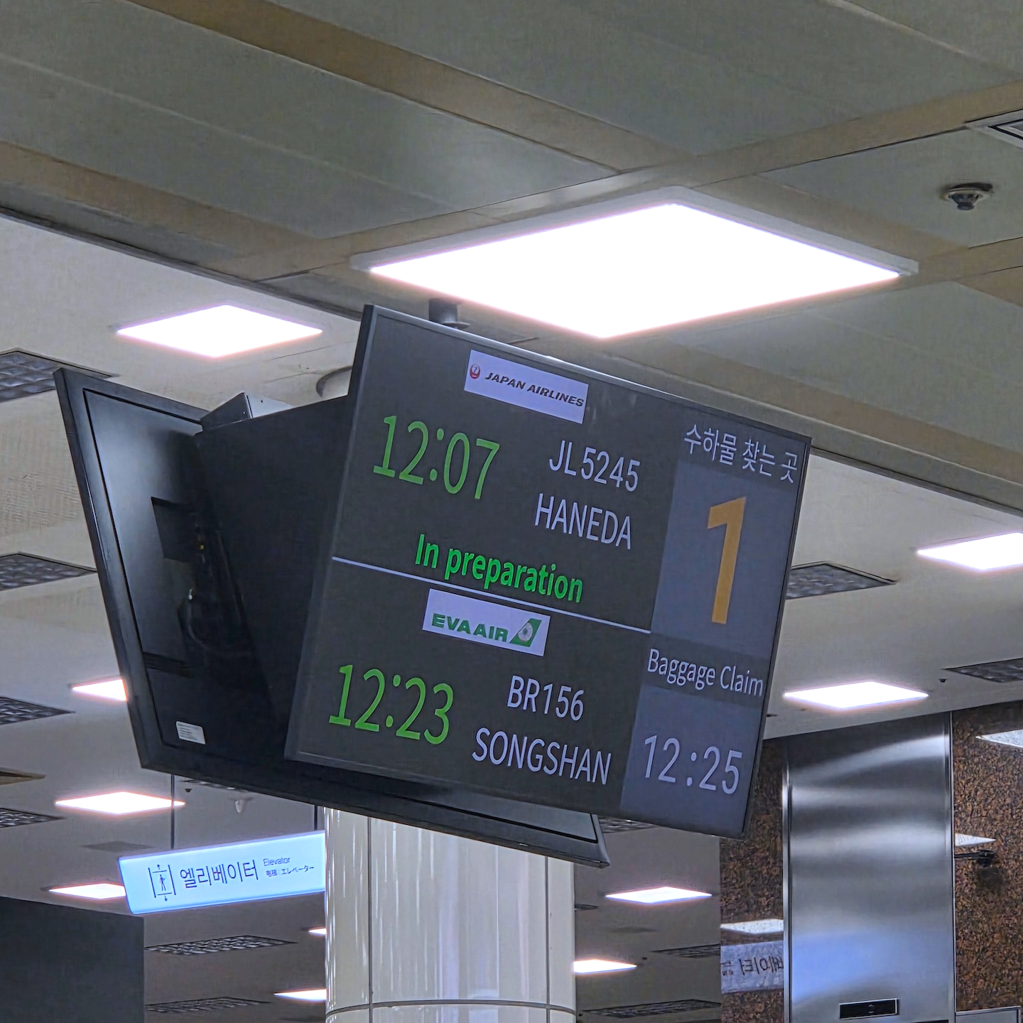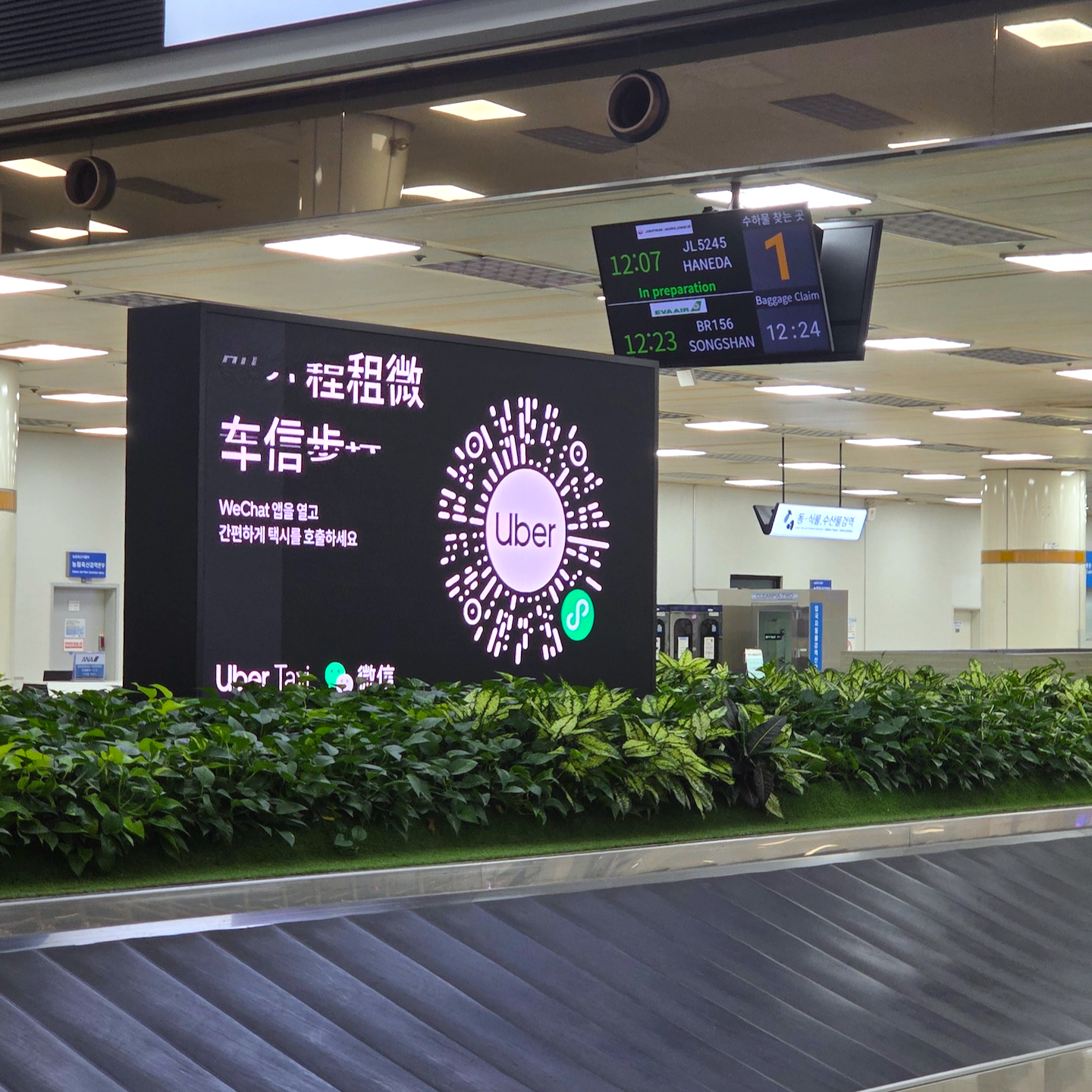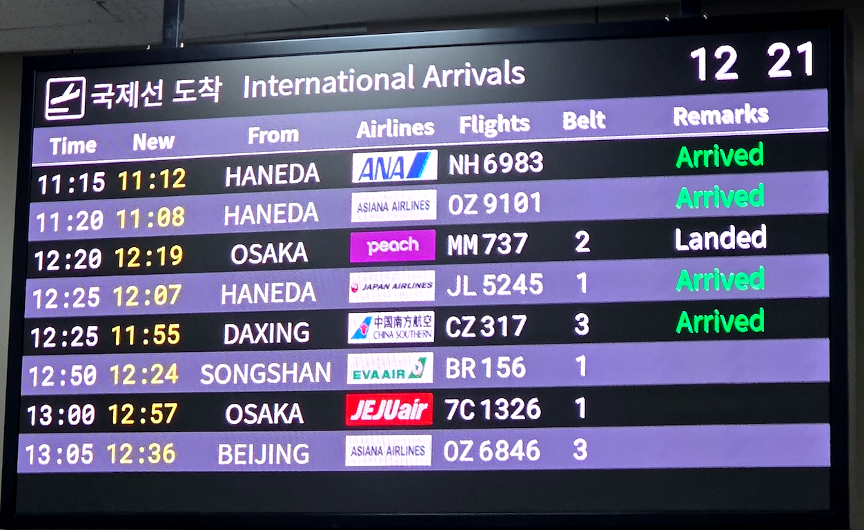 참고로 KE2106편의 도착 시간대에는 다른 국제선들도 연달아 김포공항에 들어옵니다. 베이징발 중국남방항공 CZ317편(12:25 도착)과 오사카발 피치항공 MM737편(12:20 도착)이 대표적인데요. 제가 탑승했던 날에는 저희 편 착륙 10분 전에 CZ317편이 먼저 도착한 상태였습니다. 앞선 항공편의 외국인 입국 심사가 진행 중이었던 터라 외국인 심사대에는 대기 줄이 꽤 있었지만, 내국인 심사는 거의 실시간으로 이루어져 매우 쾌적했습니다.