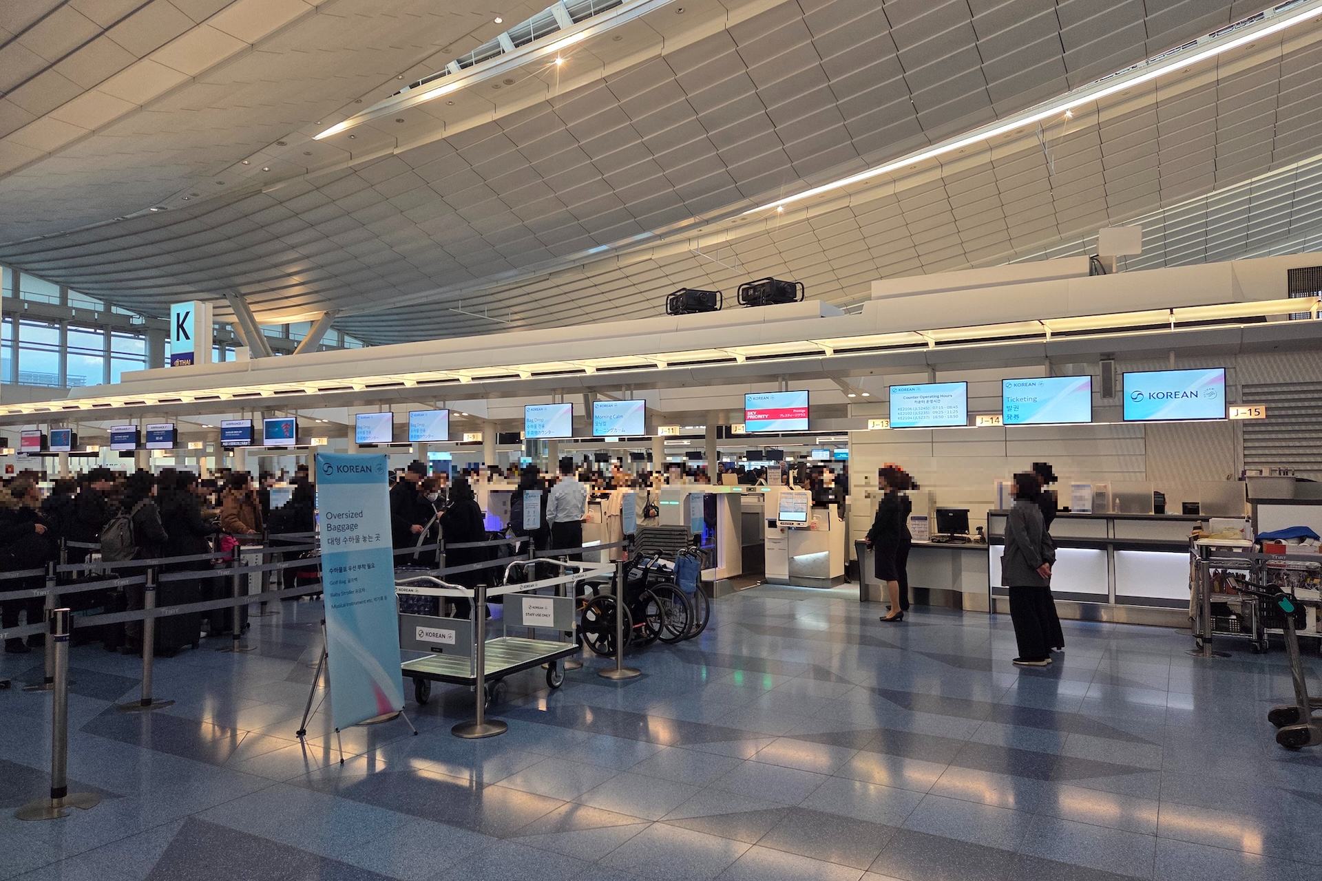 이코노미 백드롭 줄이 유독 길게 느껴질 수 있는데, 이는 아침 출발편 특성상 카운터 오픈 시간이 비행 2시간 30분 전으로 다소 짧아 승객들이 일시에 몰리기 때문으로 보입니다. 또한, 맞은편 I와 H 카운터에서 진행되는 일본항공(JAL)의 아침 출발 승객들이 J 카운터 길목까지 줄을 서는 경우가 많습니다. 대한항공 카운터로 진입하기 위해서는 이 인파를 뚫고 지나가야 하니 당황하지 마시고 안쪽으로 이동하시면 됩니다.