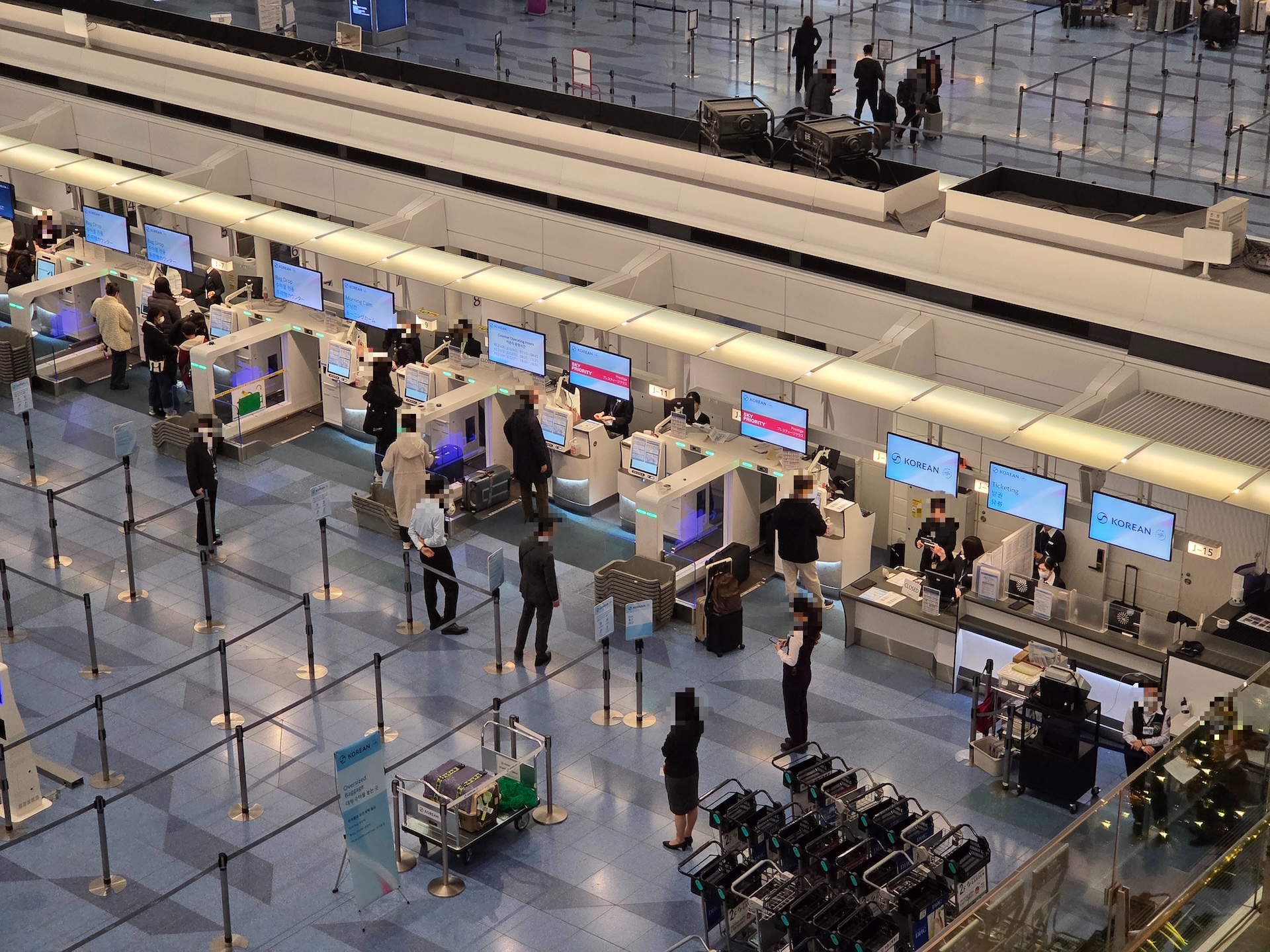 아침 체크인 시간대의 도쿄 하네다 국제공항 대한항공 카운터 KE2106편의 공식 카운터 운영 시간은 오전 7시 15분부터 8시 45분까지입니다. 다만, 현장 상황에 따라 조금 일찍 열리기도 하는데, 제가 도착했던 7시 8분에도 이미 수속이 진행 중이었습니다. 프레스티지 클래스 이용 시 스카이 프라이어리티 카운터를 통해 대기 없이 즉시 체크인이 가능했습니다.