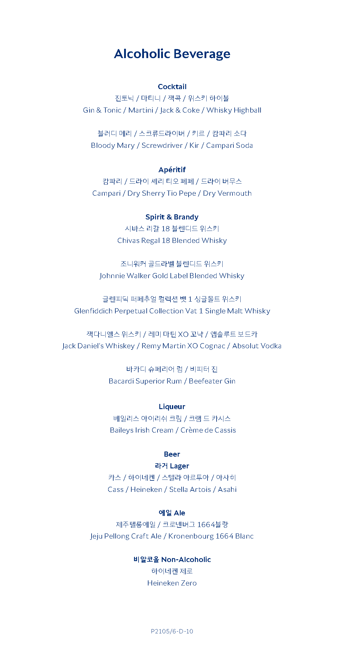 대한항공 KE2106편 프레스티지 클래스 주류 메뉴 (c) kr.koreanair.com