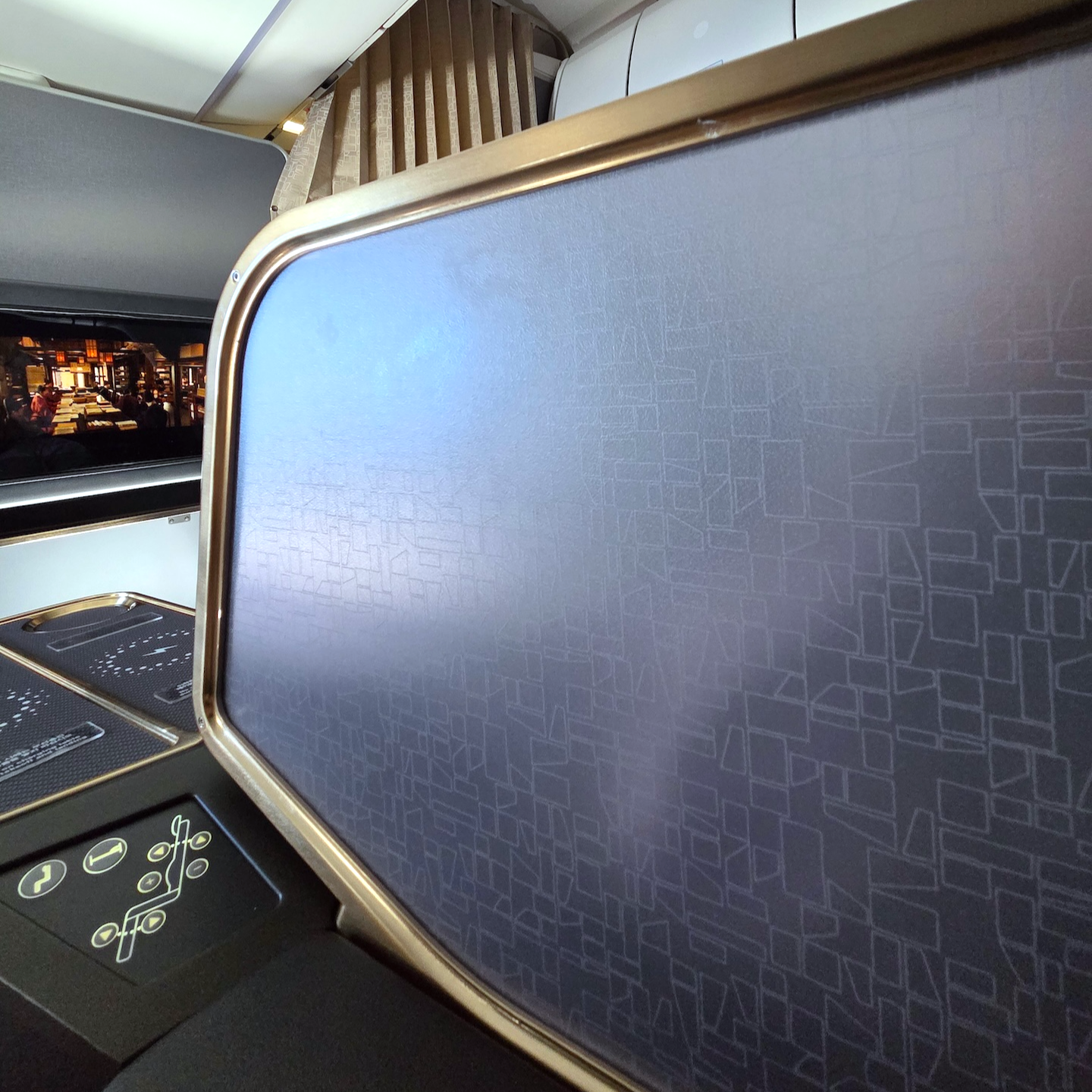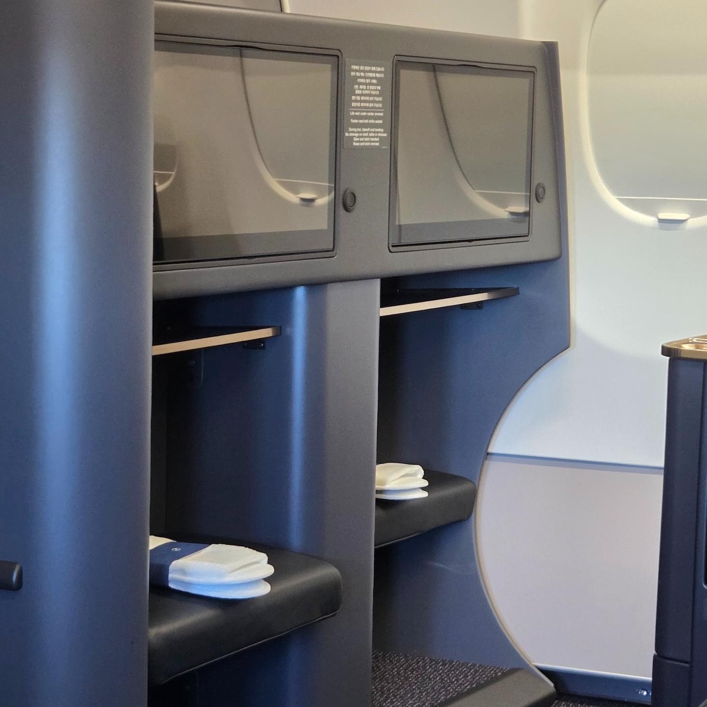 대한항공 A321neo 프레스티지 클래스 7A 좌석 제가 이용한 7A 좌석은 두 줄의 좌석 중 앞 열 왼쪽 창가 자리입니다. 대한항공의 새로운 인테리어 콘셉트가 적용되어 짙은 회색 시트에 골드 컬러가 포인트로 사용되었는데, 전반적으로 매우 중후하고 세련된 인상을 줍니다. 옆 좌석 승객과의 사이에는 반투명 파티션이 있어 시선이 직접 닿는 불편함을 어느 정도 해소해 주었습니다.
