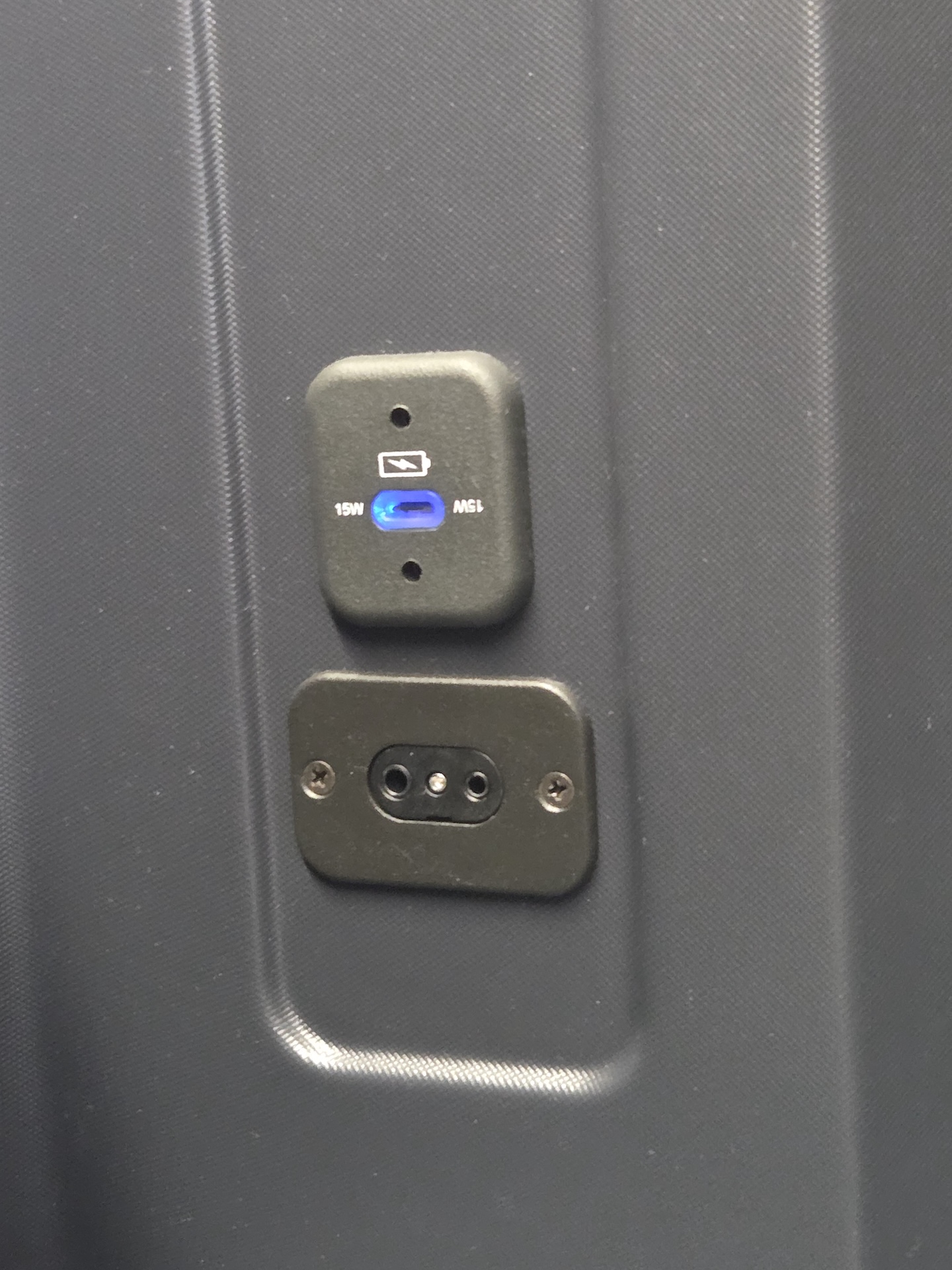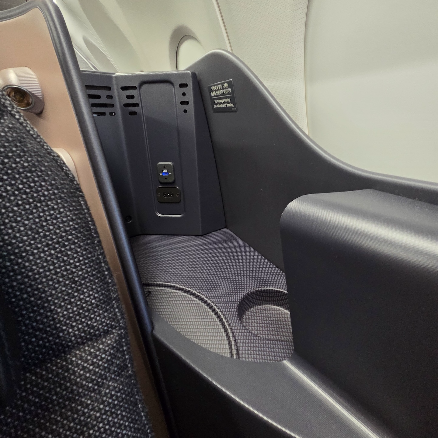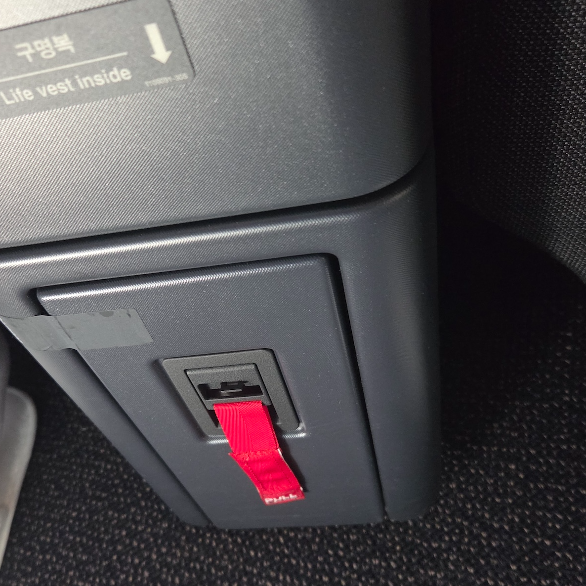대한항공 A321neo 프레스티지 클래스 7A 좌석 수납함, 충전포트, 구명복 좌석 왼쪽 뒤편에는 헤드폰 단자와 USB-C 타입 충전 포트, 그리고 페트병을 보관할 수 있는 홈이 파인 공간을 포함한 꽤 넓은 수납공간이 있습니다. 이 수납공간에는 이착륙과 활주시에는 물품을 보관하지 말라는 안내가 붙어 있기는 했는데 실제로 헤드셋과 같이 크지 않은 물건을 이착륙이 이곳에 보관해도 딱히 제지를 하지는 않았습니다. 이 수납함 역시 눈에 잘 띄지 않는 위치라 물건을 놓고 내릴 염려가 있었는데, 이런 부분은 착륙 전 안내 비디오 등에서 한 번 더 짚어주면 좋겠다는 생각이 들었습니다.