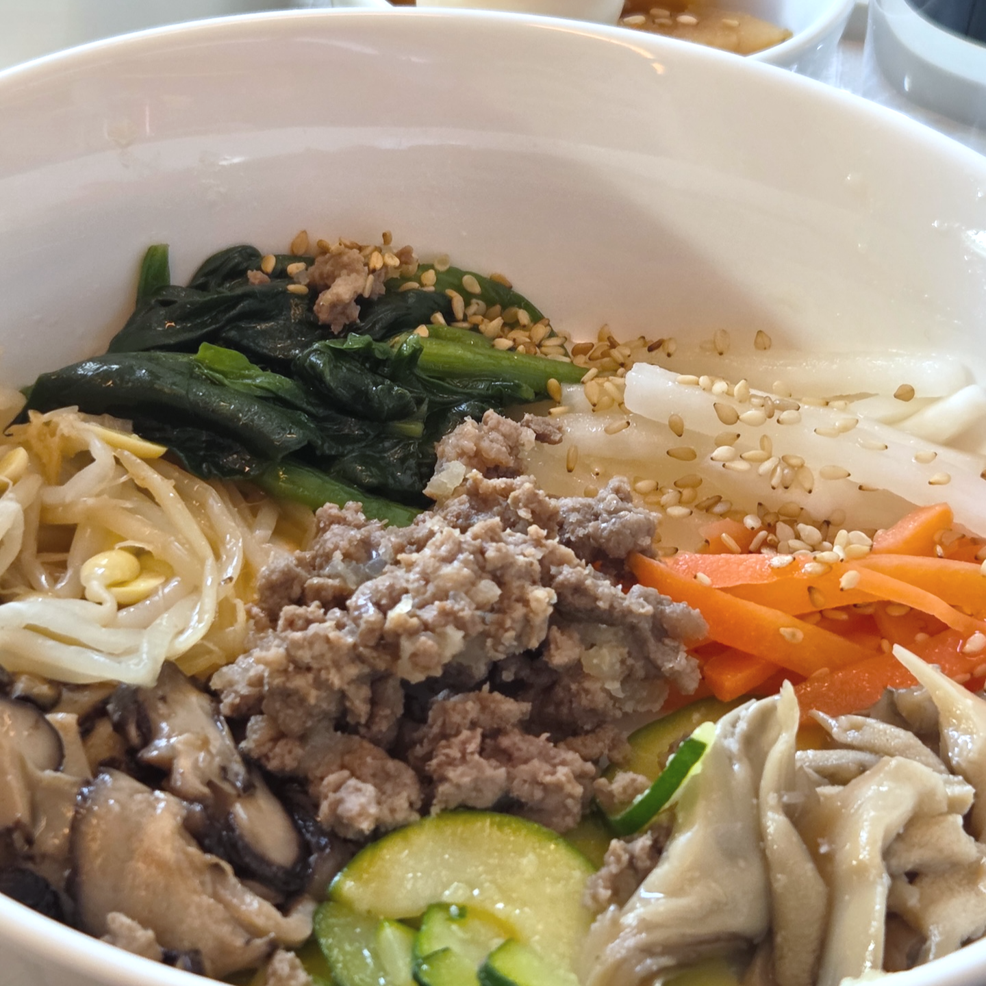 비빔밥 고명으로는 시금치, 무, 콩나물, 버섯, 호박, 당근, 쇠고기 등이 다양하게 들어있었는데, 각 재료의 맛과 향이 잘 살아있어 꽤 만족스러웠습니다. 함께 제공된 볶음 고추장과 참기름을 곁들일 때, 고추장을 적당량만 넣어 나물 본연의 맛을 살리고 참기름도 절반 정도만 넣어 풍미를 조절하는 것을 추천드립니다.