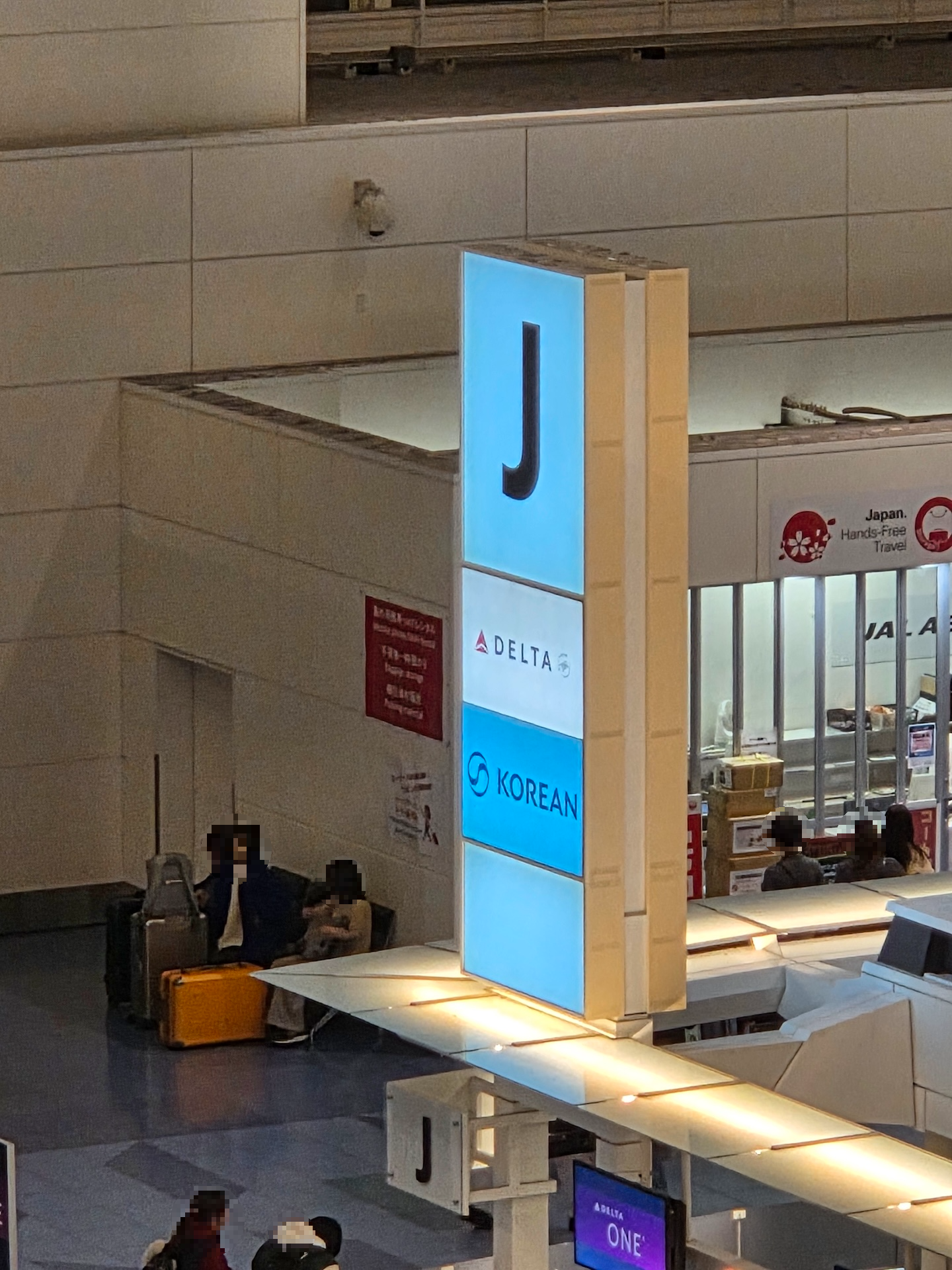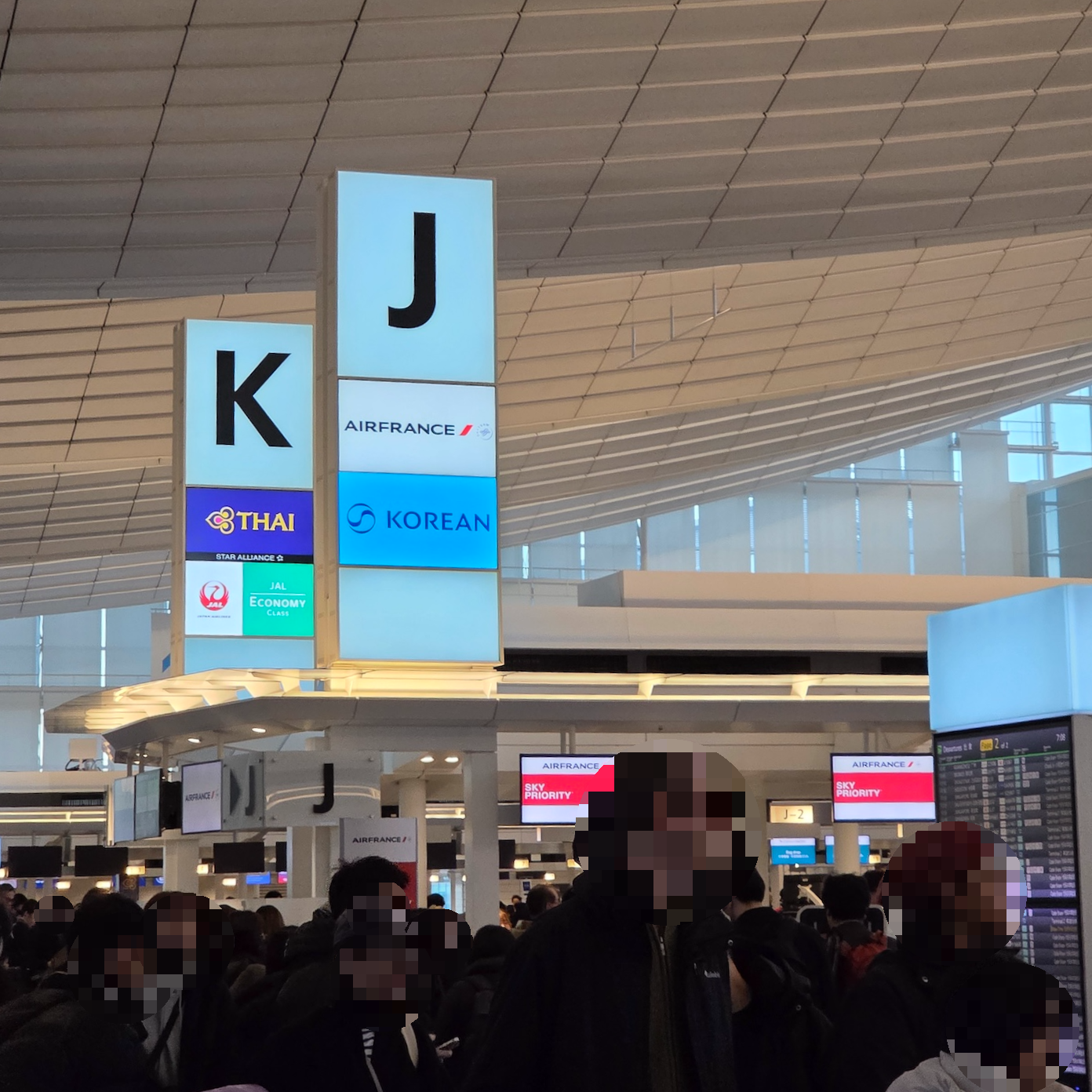 저녁 시간대의 도쿄 하네다 국제공항 대한항공 카운터 대한항공은 도쿄 하네다 국제공항 3터미널 출발층(3층) J 카운터를 이용합니다. 제가 탑승한 KE2106편의 체크인이 진행된느 아침 시간에는 에어프랑스와 카운터를 나누어 사용하며, 총 5개의 카운터(수하물 전용 3개, 모닝캄 1개, 스카이 프라이어리티 1개)와 별도의 발권 카운터가 운영됩니다.