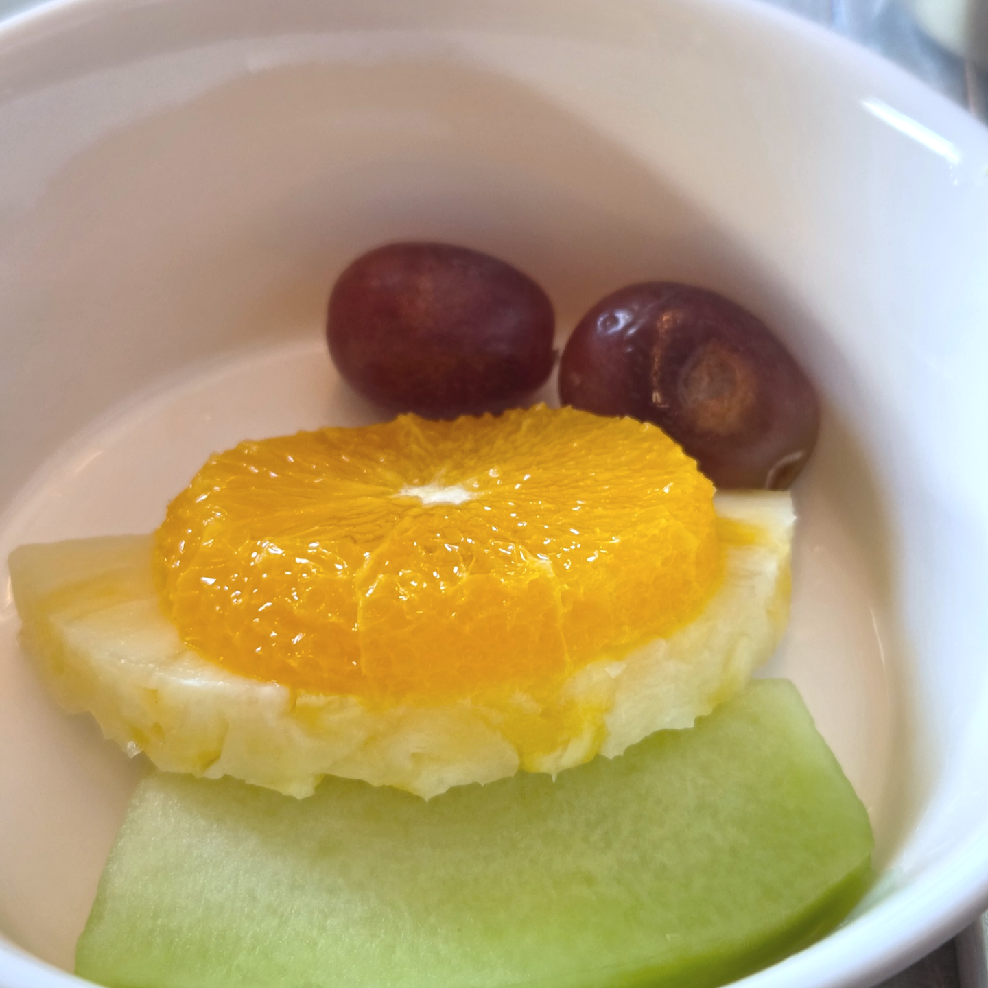 대한항공 KE2106편 프레스티지 클래스 기내식 반찬으로 나온 김, 배추김치, 당면볶음, 감자조림 중에서는 특히 상큼한 샐러드 같았던 당면볶음과 아삭한 식감이 살아있던 감자조림이 인상적이었습니다. 함께 나온 황태국 역시 칼칼하고 시원해 비빔밥과 궁합이 좋았습니다. 디저트로 제공된 모둠 과일(적포도, 오렌지, 파인애플, 멜론)은 무난한 수준이었습니다.