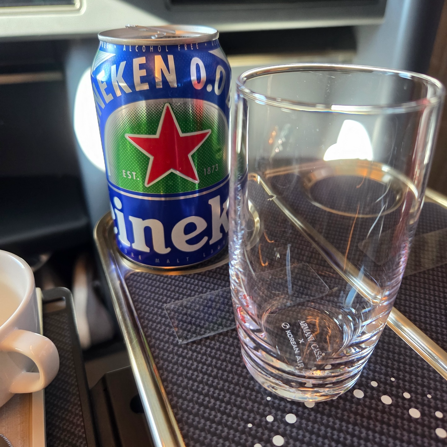 대한항공 KE2106편 프레스티지 클래스 논알콜 맥주와 커피 저는 착륙 6시간 후 운전 일정이 있어 주류 대신 하이네켄 제로(무알코올 맥주)와 홍삼차, 커피를 선택했습니다. 홍삼차의 경우 기존 정관장에서 한삼인 제품으로 변경된 점이 눈에 띄었습니다.