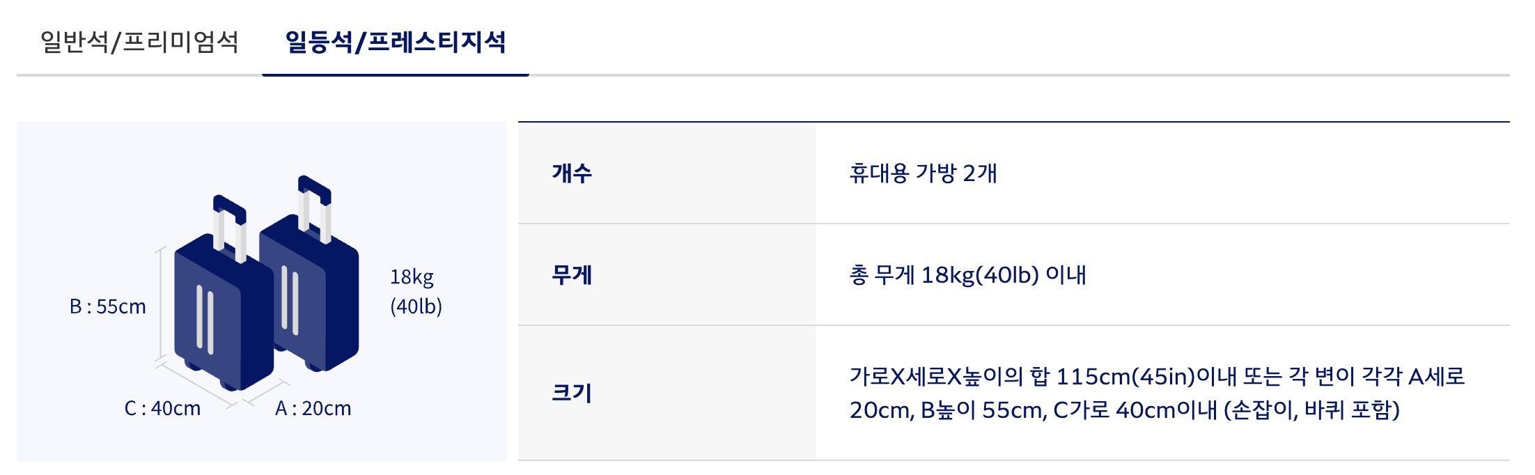 대한항공 휴대수하물 규정 (c) kr.koreanair.com 대한항공 탑승 클래스별로 다른 휴대 수하물 규정을 적용합니다. 이코노미 클래스(일반석)와 프리미엄 이코노미 클래스(프리미엄석)의 경우 휴대용 가방과 개인 소지품을 합해 총 10kg이내의 휴대 수하물을 허용합니다. 퍼스트 클래스(일등석)과 비즈니스 클래스(프레스티지석)의 경우 수하물 세 변의 합이 115cm 이내인 (우리가 흔히 아는 기내용 캐리어 사이즈) 휴대용 가방 2개, 총 18kg이내의 휴대 수하물을 허용합니다.
