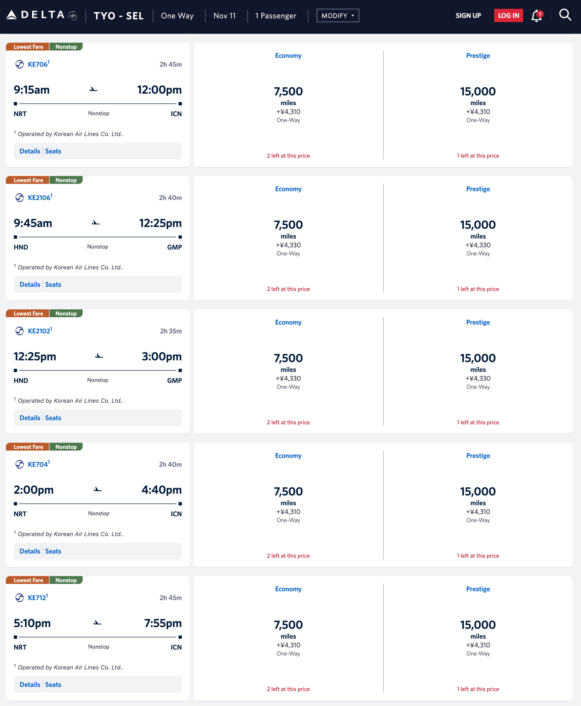 델타항공 스카이마일즈로 발권한 이번 대한항공 KE2106편 (c) delta.com 대한항공은 스카이팀 파트너사인 델타항공의 '스카이마일즈(SkyMiles)' 프로그램을 통한 어워드 좌석 예약을 허용하고 있습니다. 한일 노선의 경우, 델타 마일을 활용하면 편도 기준 이코노미 클래스는 7,500마일, 프레스티지 클래스는 15,000마일이라는 매우 합리적인 마일리지로 발권이 가능합니다. 저 또한 이번 여정을 위해 델타 마일 15,000마일과 세금 및 유류할증료 약 28.6달러(약 4,330엔)를 지불했습니다.
