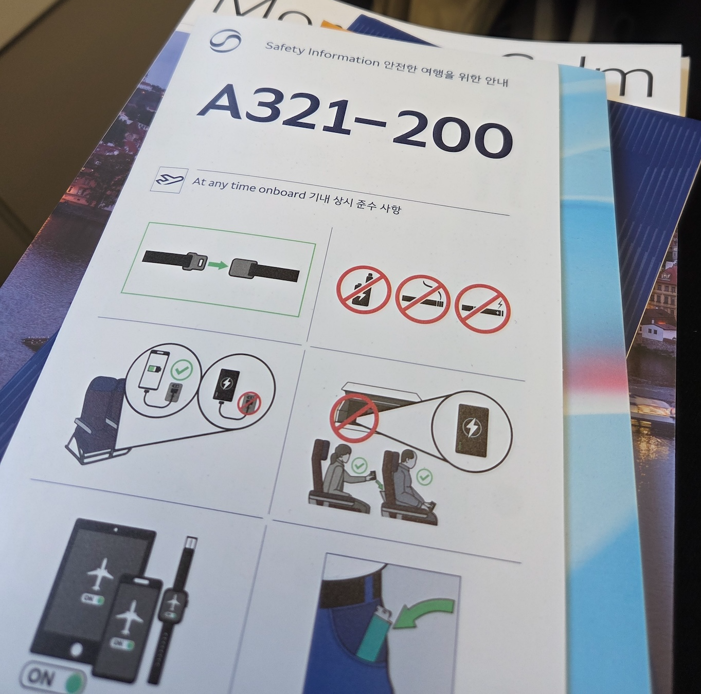 대한항공 A321neo 세이프티 카드, 면세품 예약 주문서, 위생봉투 대한항공의 프레스티지 슬리퍼 2.0은 콜린스 에어로스페이스의 '다이아몬드' 모델을 기반으로 하며, 이미 여러 항공사에서 오랜 기간 검증된 좌석이기에 대한항공만의 유니크한 최신 하드웨어라고 보기는 어렵습니다. 하지만 중단거리용 협동체 기종의 비즈니스 클래스에서 여전히 많은 항공사가 등받이만 젖혀지는 리클라이너나 이코노미 좌석의 가운데를 비워 파는 유로 비즈니스 형태를 운영한다는 점을 고려하면, 협동체 기종에서 180도 풀 플랫 좌석을 제공한다는 것은 확실한 경쟁우위입니다. 몇몇 하드웨어적인 디테일과 마감에서 아쉬움은 보이지만, 대한항공의 새로운 중후한 디자인과 세련된 톤앤매너 덕분에 대한항공의 프레스티지 슬리퍼 2.0은단거리 비즈니스 좌석으로서 부족함 없는 가치를 충분히 증명하고 있습니다.