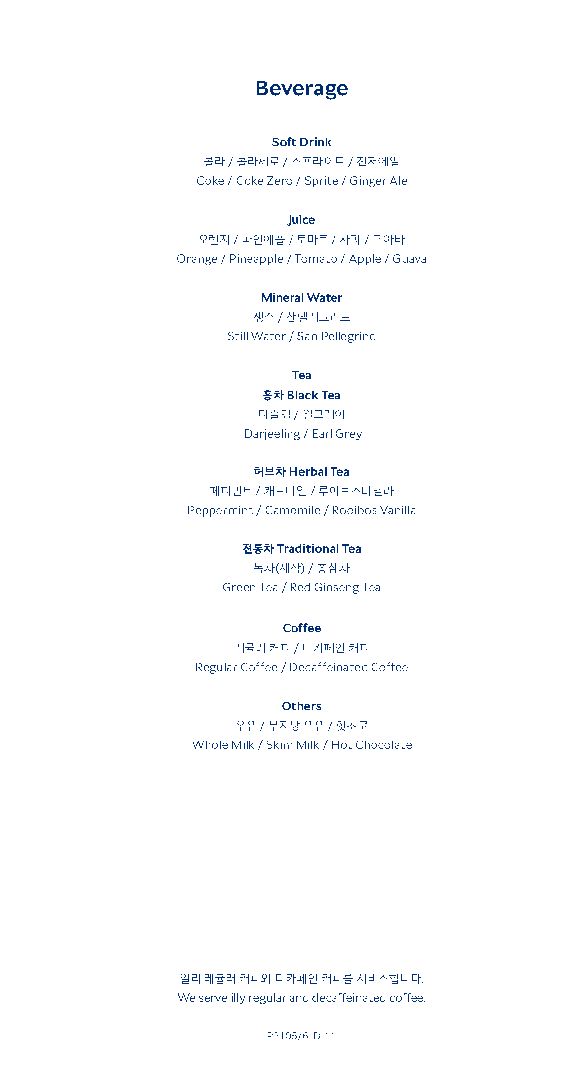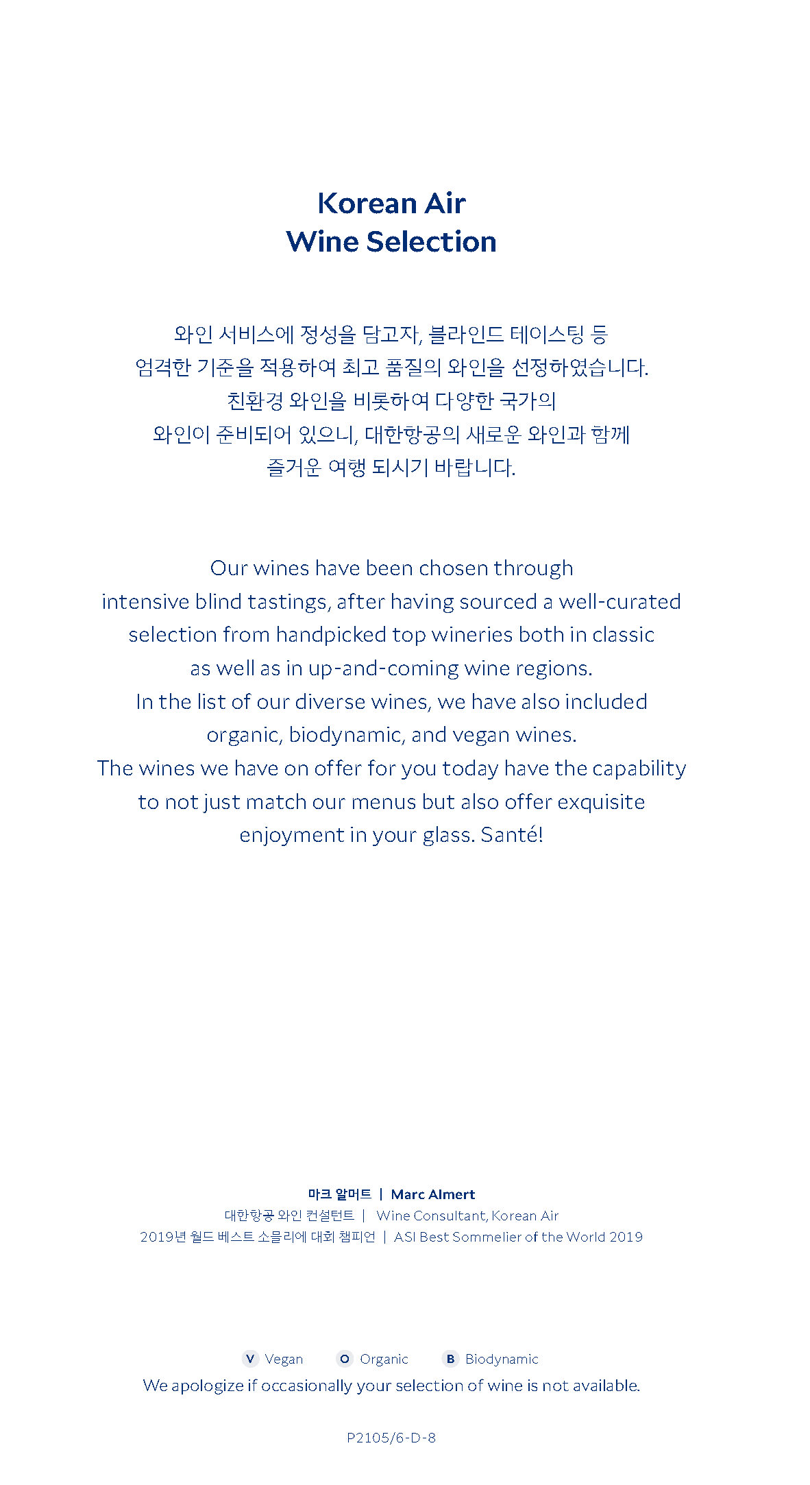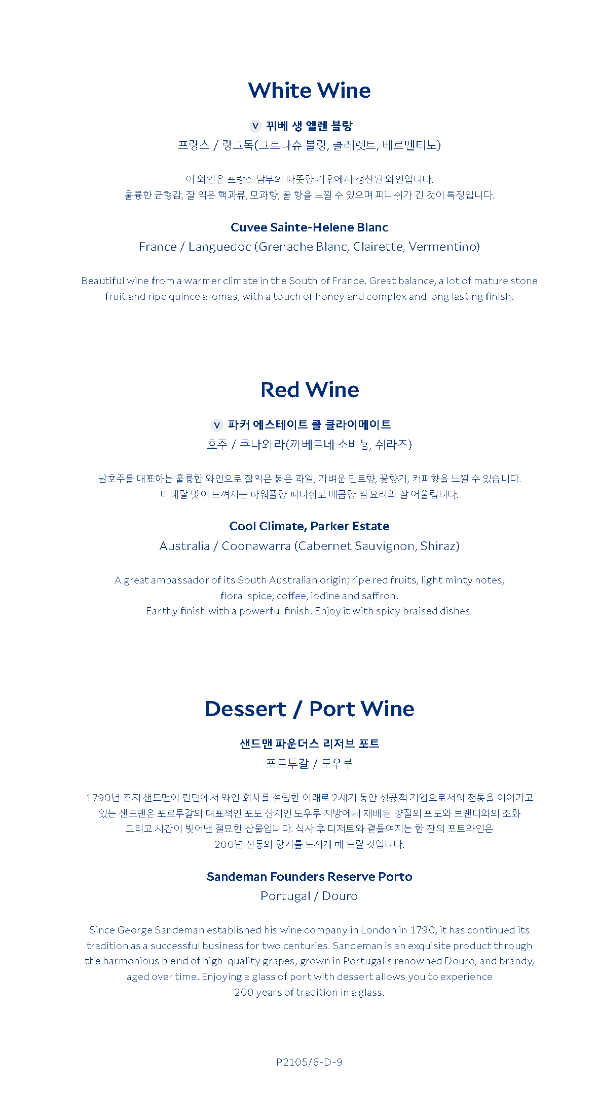 대한항공 KE2106편 프레스티지 클래스 주류 메뉴 (c) kr.koreanair.com KE2106 프레스티지 클래스의 주류 및 음료는 단거리 노선 특성상 다소 간소화된 구성으로 제공되었습니다. 와인은 화이트와 레드, 그리고 디저트용 포트 와인이 각각 1종씩 준비되어 있었으며, 위스키 등 고도주는 대한항공 프레스티지 클래스의 표준 구성을 따르고 있었습니다.