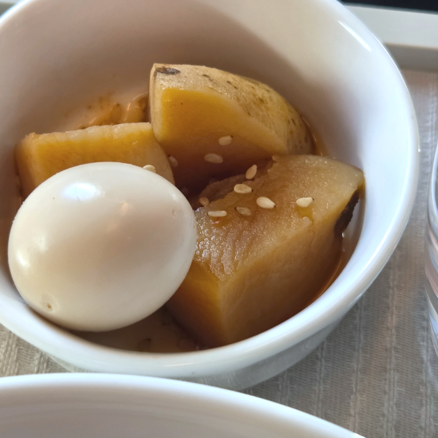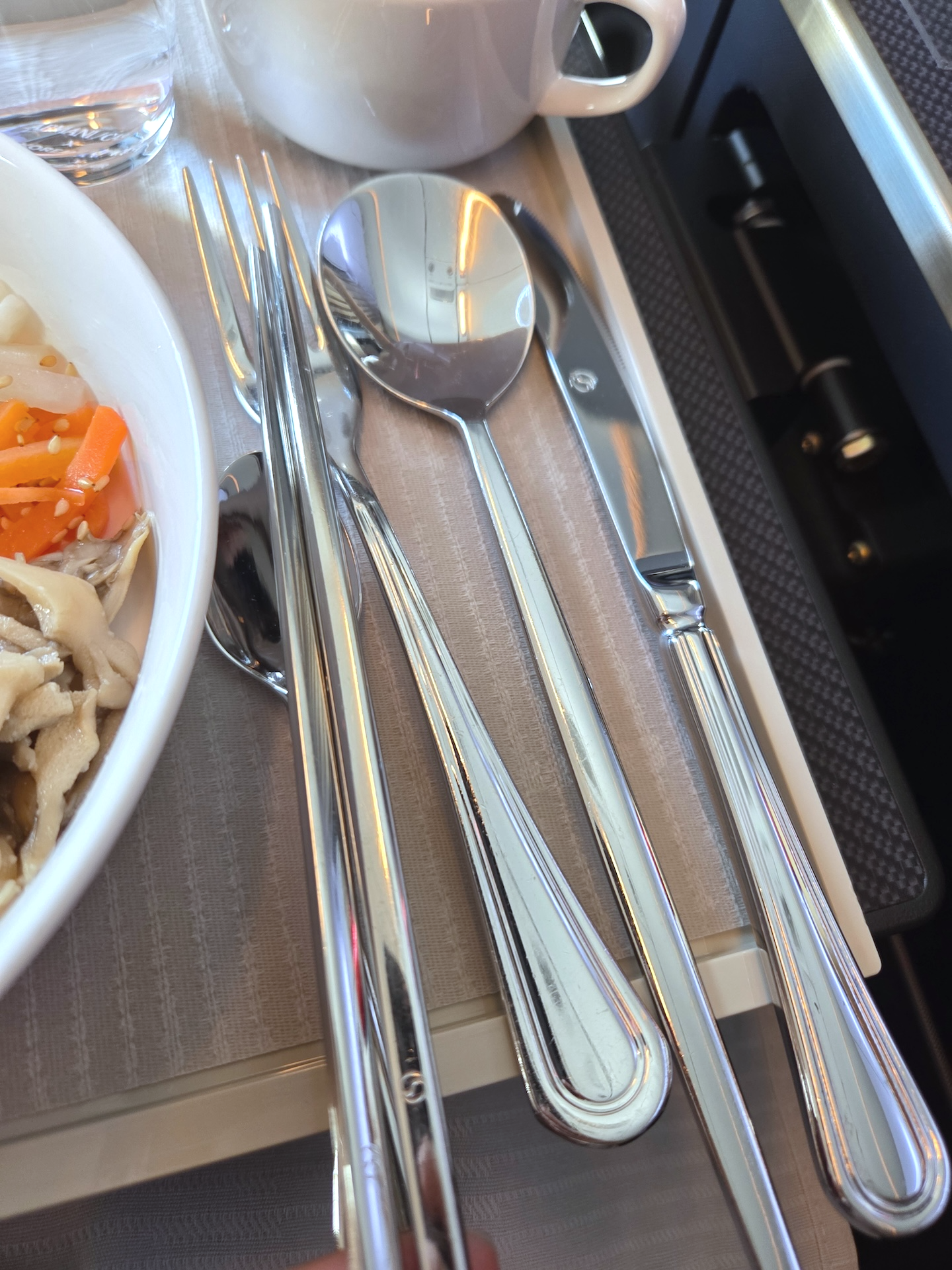 대한항공 KE2106편 프레스티지 클래스 기내식 전반적으로 단거리 노선임을 감안하면 훌륭한 기내식이었습니다. 작년 5월 도입된 새로운 디자인의 식기류도 정갈했고, 해외 출발 노선임에도 한식의 완성도가 높았습니다. 다만, 기내식 사전 주문이 되지 않는 노선에서 "언제까지 한식으로 비빔밥만 제공될 것인가"라는 메뉴의 단조로움에 대한 의문과, 한식을 먹는 데 필요한 수저 외에도 포크, 티스푼, 나이프까지 모두 포함된 커틀러리 구성은 다소 과하다는 인상을 주었습니다. 물론 기내식 메뉴와 상관없이 단일 커틀러리 세트를 제공하는 것이 운영 효율 면에서는 더 유리할 수 있겠지만, 승객 입장에서는 불필요한 자원 낭비처럼 느껴지는 지점이기도 했습니다.