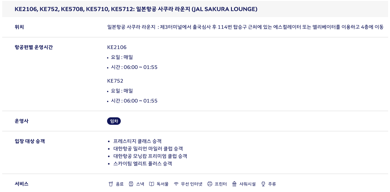 대한항공 KE2106편 도쿄 하네다 국제공항 라운지 정보 (c) kr.koreanair.com 대한항공은 도쿄 하네다 국제공항에서 자체 라운지가 아닌 위탁 라운지를 제공하고 있으며, 탑승 편명에 따라 제공 라운지가 달라집니다. 먼저 제가 탑승한 KE2106편을 포함해 야간에 출발하는 KE752편, 그리고 일본항공 코드셰어편인 KE5708, KE5710, KE5712에 탑승하는 경우 일본항공 사쿠라 라운지를 이용할 수 있고, 이 노선 이외에 KE2102, KE2104에 탑승하는 경우 델타 스카이클럽을 이용할 수 있습니다.