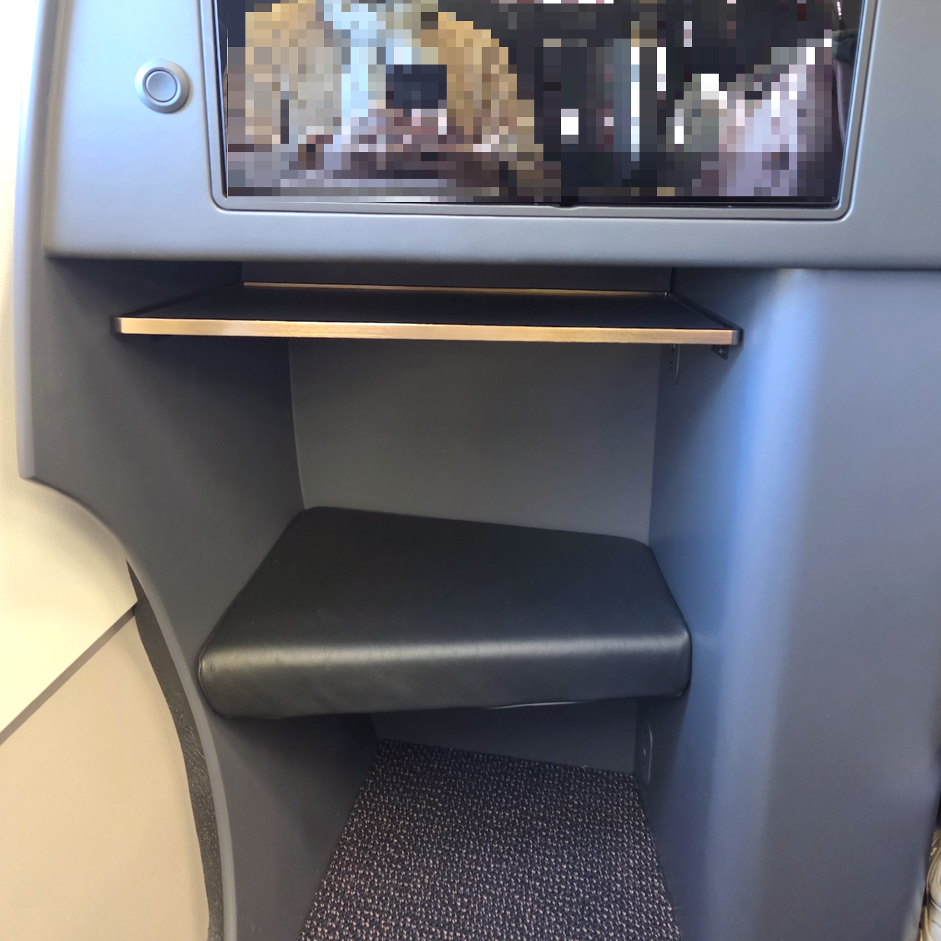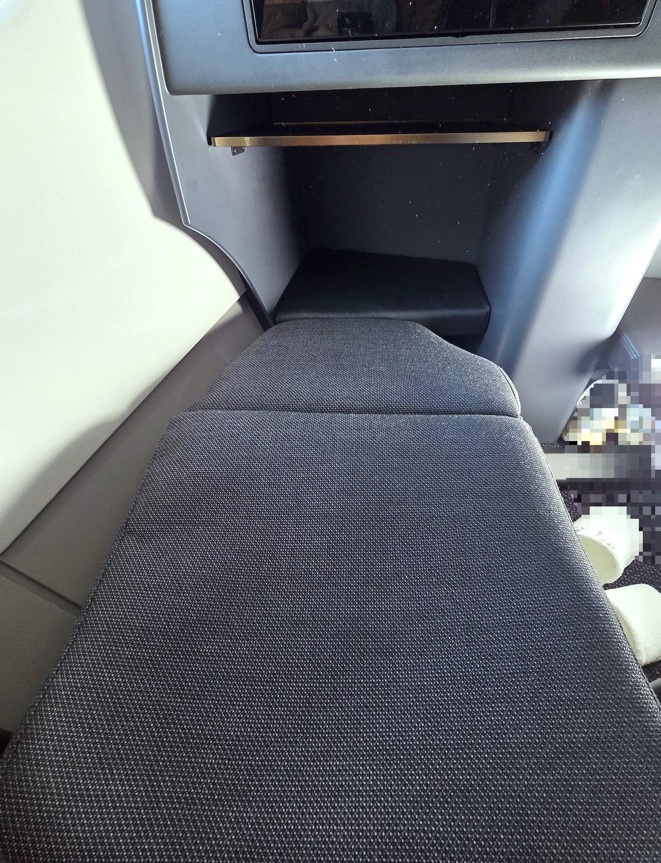 대한항공 A321neo 프레스티지 클래스 7A 좌석 오토만, 팔걸이 대한항공 A321neo 프레스티지석의 7열(앞열)은 8열(뒷열)에 비해 확실한 우위가 있습니다. 바로 발을 놓는 오토만 공간의 차이입니다. 8열의 오토만은 앞 좌석 옆 공간으로 들어가도록 설계되어 다소 비좁은 반면, 7열은 앞 좌석이 없어 공간 전체를 오토만으로 활용할 수 있습니다. 누웠을 때 양발을 자유롭게 움직일 수 있을 정도로 공간이 넓어 훨씬 쾌적했습니다. 또한 7A 좌석 기준으로 창가 쪽 팔걸이를 아래로 내릴 수 있어, 누웠을 때 침대 폭을 조금 더 넓게 쓸 수 있는 점도 장점입니다.
