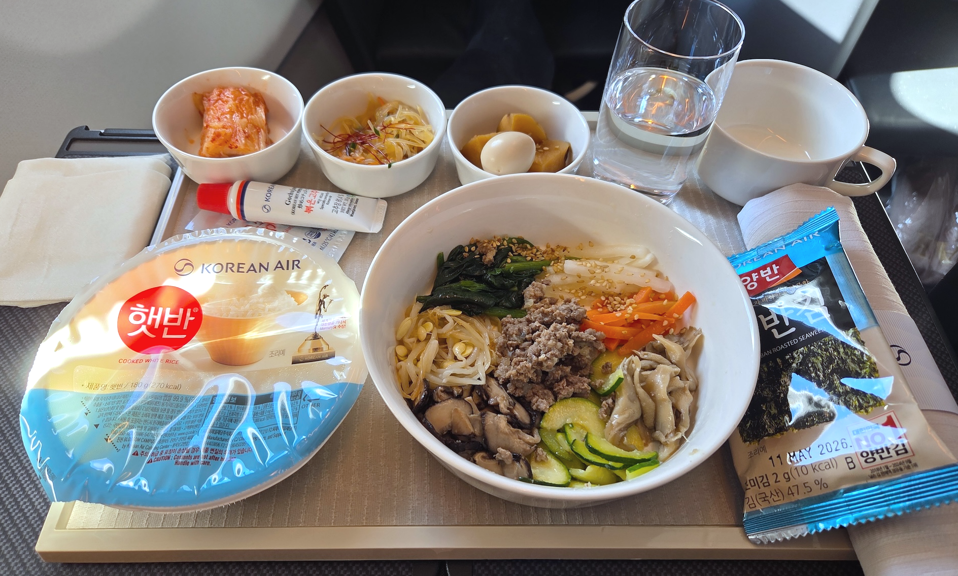 대한항공 KE2106편 프레스티지 클래스 기내식 비빔밥은 따뜻하게 데워진 햇반과 함께 제공되었습니다. 다만, 햇반이 포장이 제거되지 않은 채 용기 그대로 서빙된 점은 다소 의외였습니다. 사용자 편의나 위생을 고려한 선택일 수도 있겠으나, 프레스티지 클래스라는 점을 생각하면 그릇에 옮겨 담아 정돈된 형태로 내놓는 것이 더 적절하지 않았나 하는 아쉬움이 남습니다.