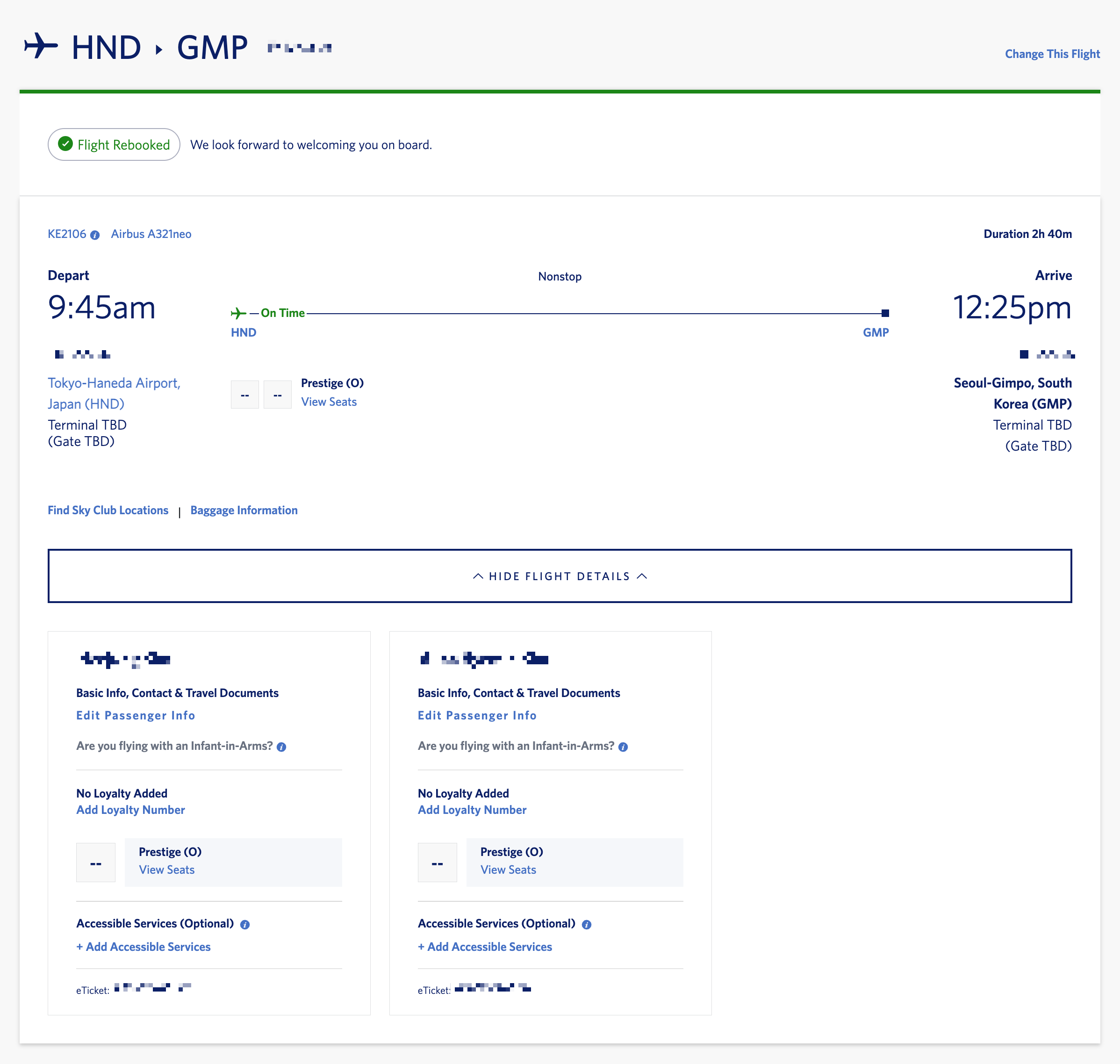 - KE2106, 일본 도쿄 하네다 국제공항(HND) → 한국 서울 김포 국제공항(GMP)