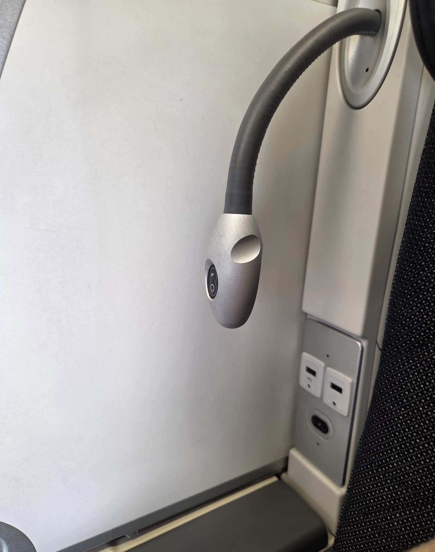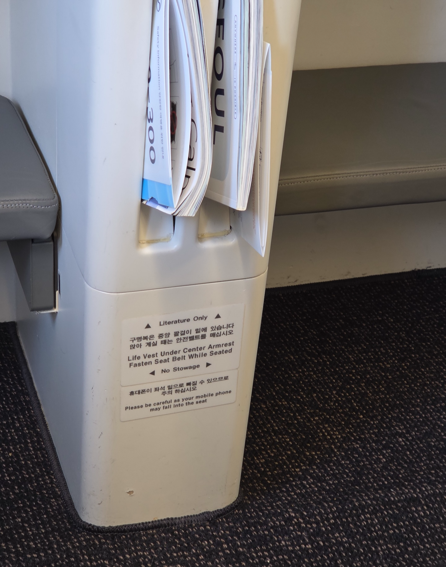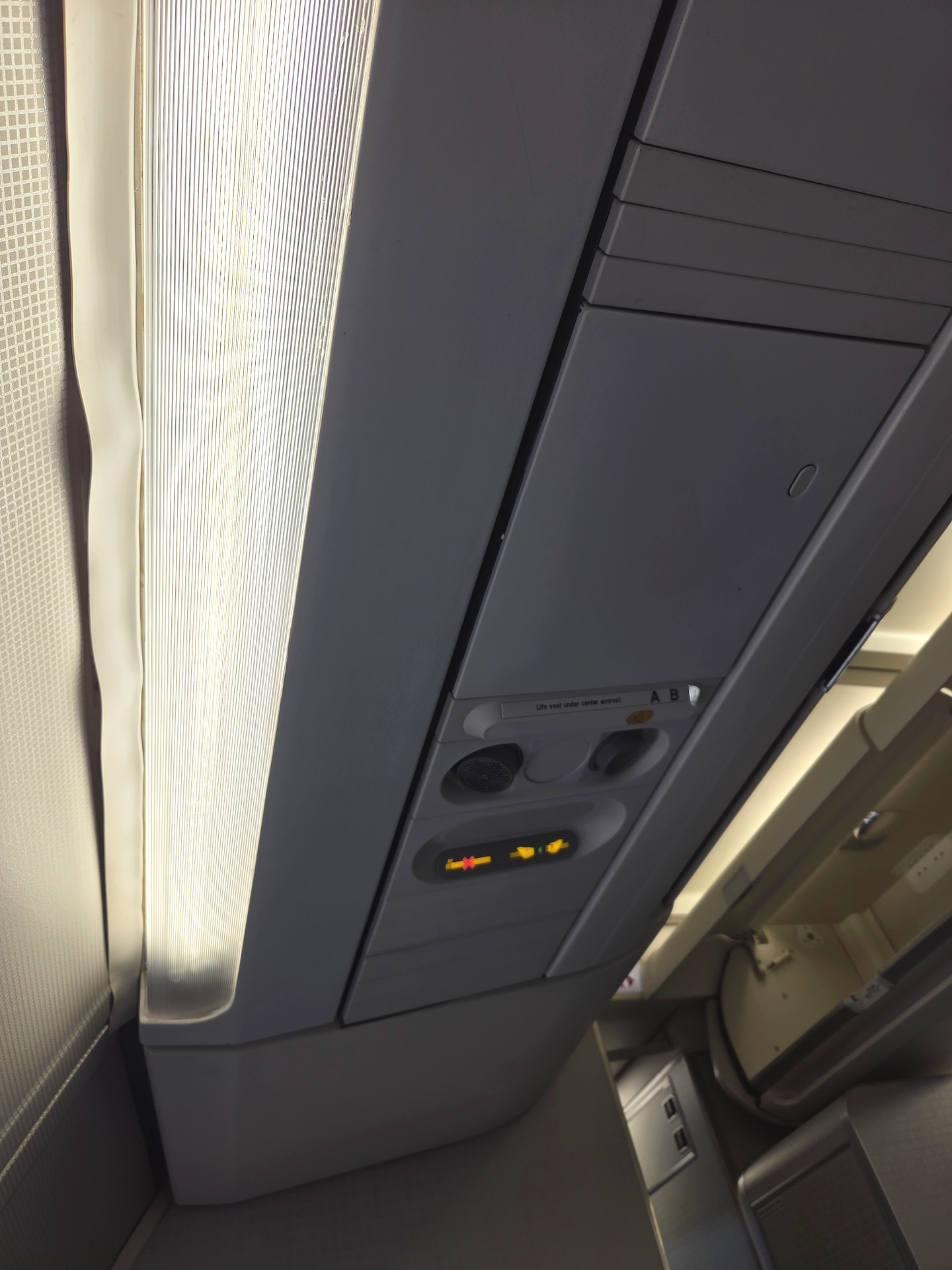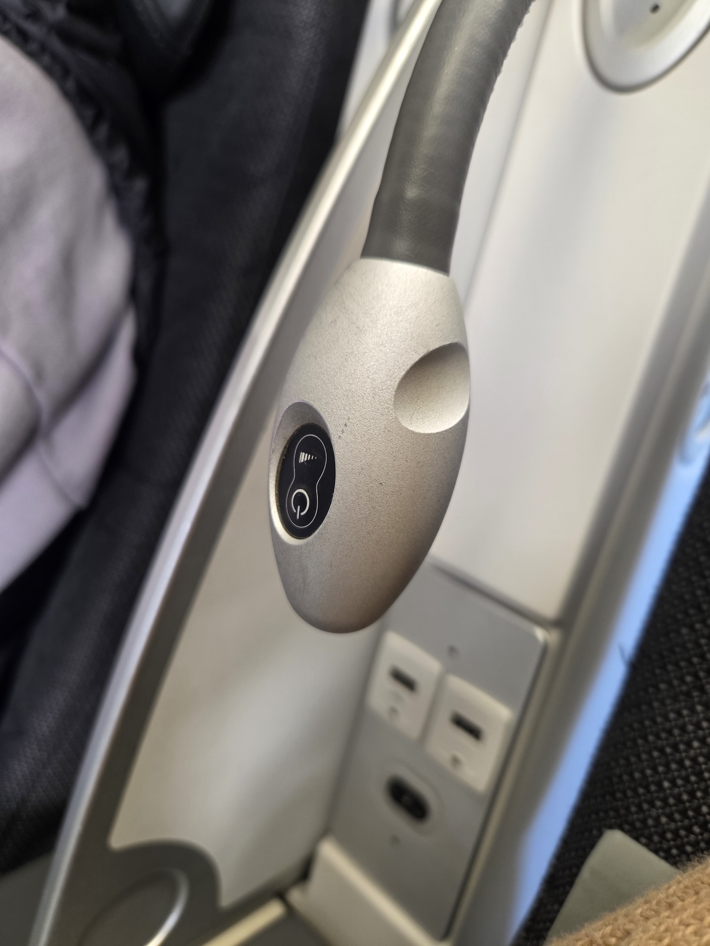 대한항공 A330-300 프레스티지 클래스 1A 좌석 독서등, USB-A 포트, 전원 콘센트 좌석 오른쪽에는 가림막이 설치되어 있었고, 옆 좌석 승객과 아는 사이가 아닐 때 가림막을 펼치면 최소한 아이컨텍은 피할 수 있을 정도로 뽑을 수 있었습니다. 그 옆으로는 밝기를 조절할 수 있는 독서등이 있었고 그 아래로는 한 좌석당 2개의 USB-A 충전 포트와 헤드셋 단자가 있었습니다. 참고로 충전 포트의 속도는 아주 느린 편이었습니다. 대신 A열 좌석과 B열 좌석 중앙 아랫쪽에 전원 콘센트가 있어서 충전기를 휴대하셨다면 충전기를 이용해 충전하시는 걸 추천합니다. 또한 전원 콘센트가 있는 부분에 구명조끼도 있었습니다.