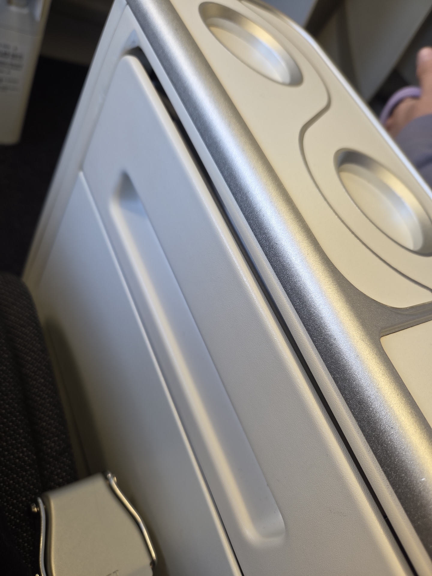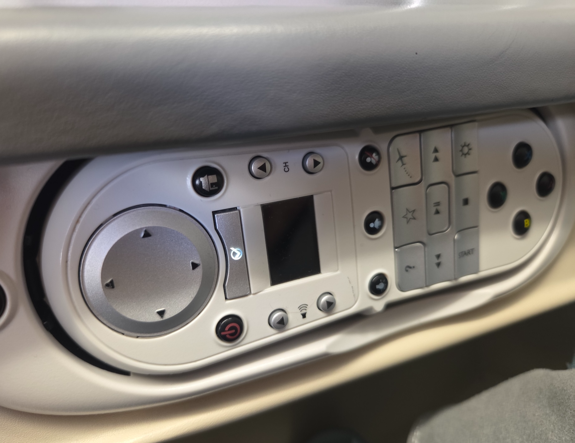 대한항공 A330-300 프레스티지 클래스 1A 좌석 조절 버튼, 리모컨, 컵홀더 좌석 왼쪽에는 시트 컨트롤러 버튼이 있었는데, 시트 색상을 바꾸는 작업을 하면서 이 버튼도 고쳤는지 버튼들의 상태가 꽤 좋았습니다. 시트 오른쪽, 팔걸이 아래로는 기내 엔터테인먼트 시스템을 컨트롤할 수 있는 옛날 스타일의 유선 리모컨이 있었고요, 그 앞으로는 테이블이 있었습니다. 테이블은 접이식으로 되어 있어서 반만 펼칠 수 있고 전부 펼칠 수도 있었지만, 국내선이라 따로 사용할 일은 없었습니다. 오른쪽 팔걸이 앞으로는 컵 홀더가 있었고, 특유의 물결모양으로 어느 좌석의 컵홀더인지 구분할 수 있게 되어있었습니다.