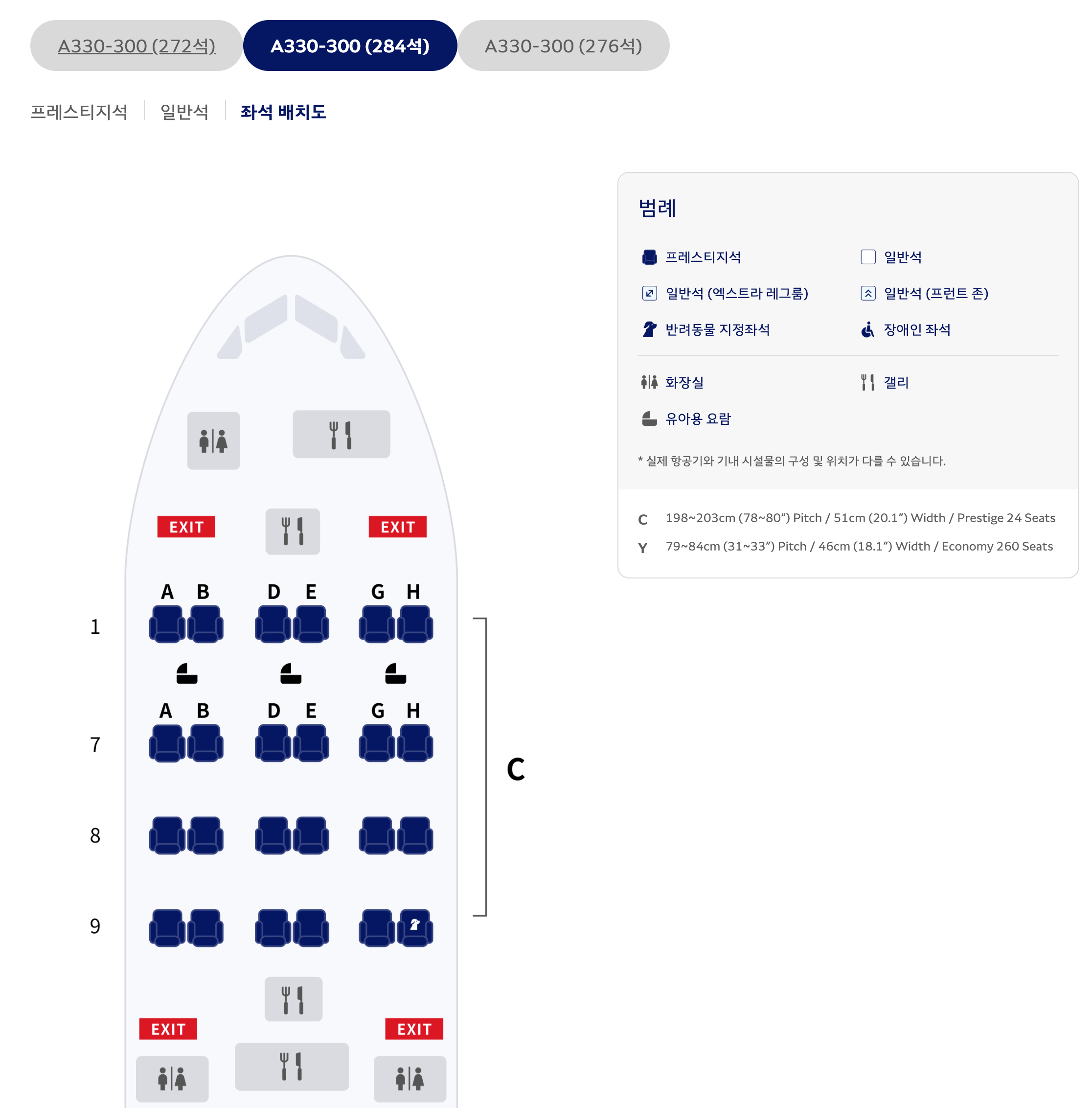 대한항공 284석 A330-300 좌석배치도 (c) koreanair.com