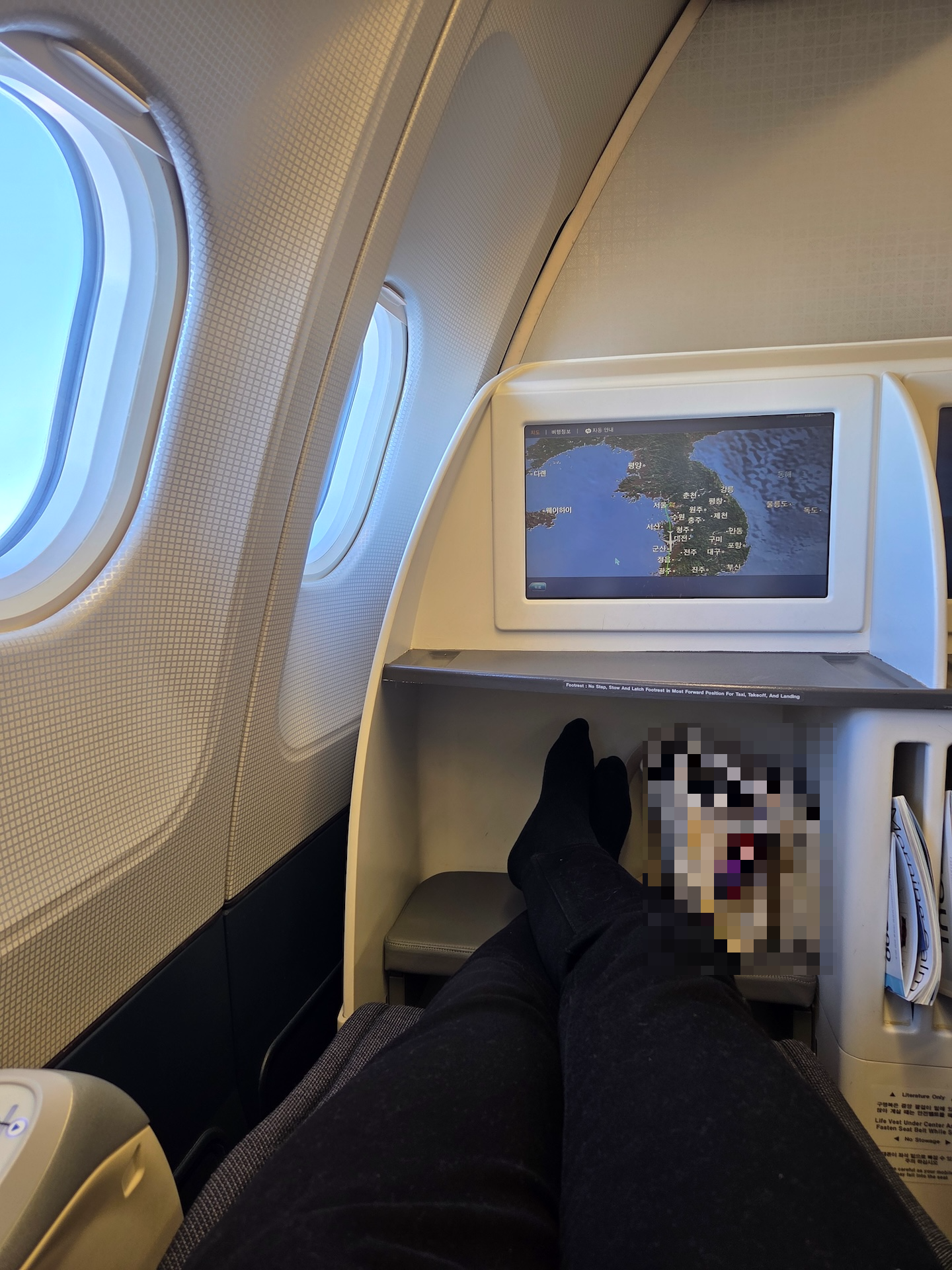 대한항공 A330-300 프레스티지 클래스 1A 좌석과 개인등 프레스티지 클래스 좌석이 24석, 이코노미 클래스 좌석이 260석이 들어가는 대한항공 A330-300 항공기의 1열 프레스티지 슬리퍼 좌석은 오래되었지만, 기본적인 관리는 되어 있는 편이었습니다. 1시간 남짓 걸리는 국내선 노선에서 풀 플랫 비즈니스 좌석을 탈 수 있다는 점은 큰 장점이고요, 그중에서도 과거 퍼스트 슬리퍼로 운영되는 좌석은 발 공간도 넉넉하고 편해서 국내선 대한항공 프레스티지 클래스에서 만나볼 수 있는 최고의 좌석 중 하나가 아닌가 싶습니다. 제가 탑승했을 때 이 항공기는 서울 김포 국제공항과 제주 국제공항을 오가는 항공기로 사용되었지만, 1월 말부터는 인천으로 날아가서 최대 7시간 정도 걸리는 인천 - 쿠알라룸푸르 노선에토 투입되었는데요, 개인적으로 이 항공기의 1열 프레스티지 클래스 좌석은 이런 중거리 노선에서도 편한 휴식을 취하기에 충분한 것 같습니다. 다만, 옆 좌석에 모르는 사람이 탄다면, 그 점은 불편할 수 있겠네요.