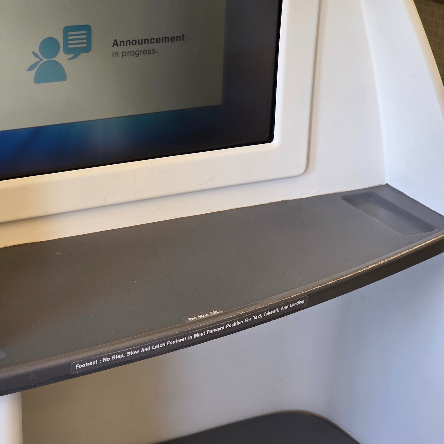 대한항공 A330-300 프레스티지 클래스 1A 좌석 책자 보관함과 기내지, 세이프티 카드 좌석 앞으로는 과거 이 좌석이 일등석 슬리퍼 시트였다는 것을 나타내주는 커다란 오토만이 있었습니다. 오토만 위에는 선반이 있었고, 이곳에 앉지 말라는 문구도 친절하게 쓰여 있었습니다. 오토만 옆으로는 기내 책자, 세이프티 카드, 위생봉투들이 수납되어 있는 수납함이 있었고 그 위로 기내 엔터테인먼트 스크린이 있었습니다.