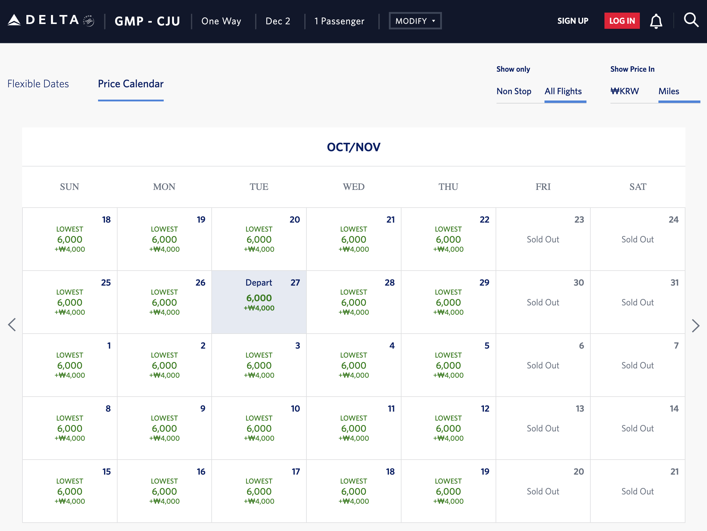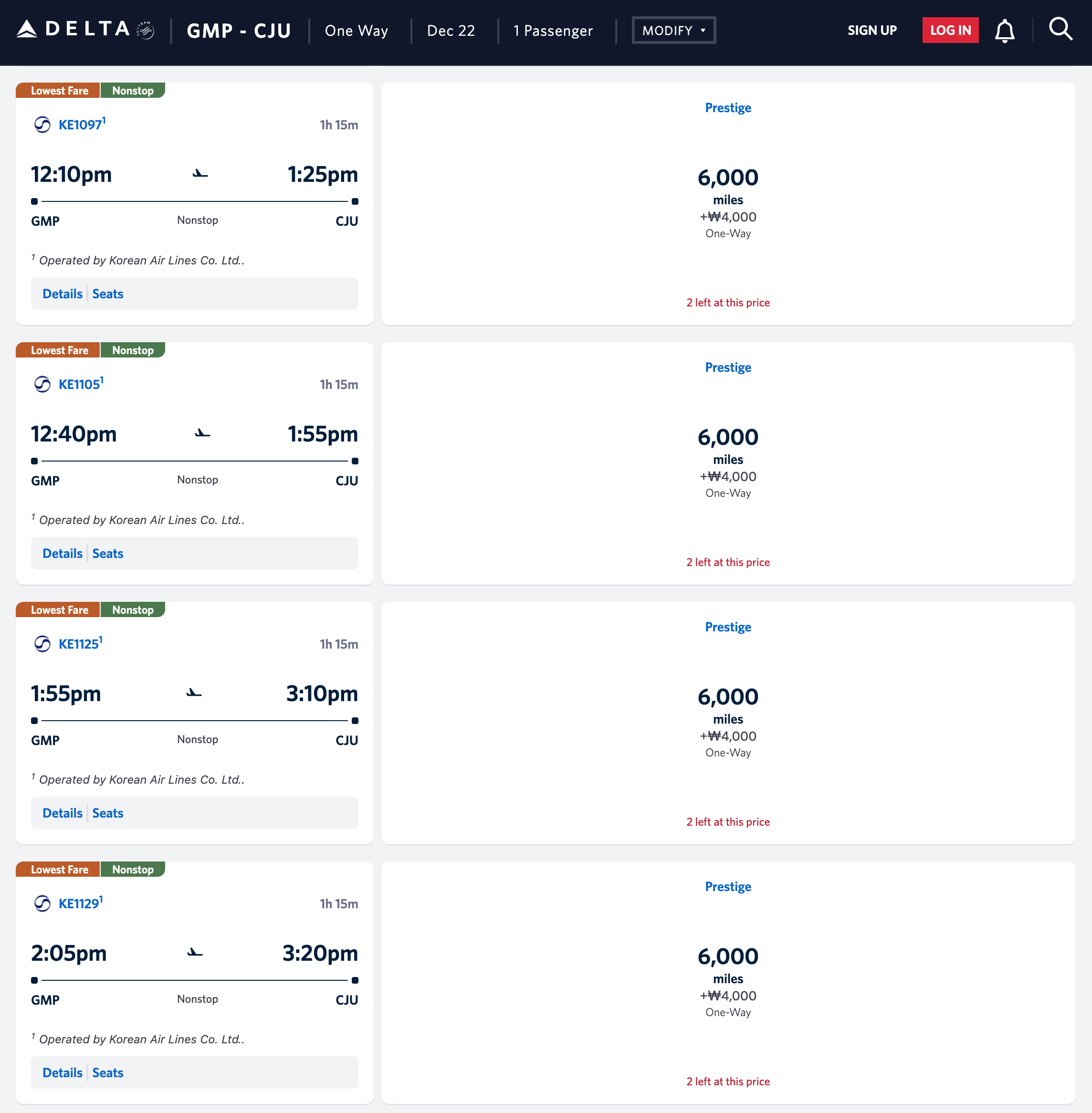 델타항공 마일로 대한항공 국내선 발권 (c) delta.com 김포에서 출발해 제주까지 가는 이번 프레스티지 클래스 항공권은 현금으로 발권했습니다. 대한항공 국내선 프레스티지 클래스는 C클래스로 발권되며 제가 발권할 때의 가격은 운임 177,000원에 세금 4,000원을 더해 총 187,600원에 발권했습니다. 참고로 이 노선은 델타항공 스카이마일즈로 발권하면 좋은 효율로 델타항공 마일을 사용할 수 있습니다. 프레스티지석 기준 가격은 6천 마일에 세금 4,000원이며 김포발 제주행 기준 금요일과 토요일을 제외하고 발권할 수 있습니다. 시간에 따라 발권이 안 되는 항공편이 있을 수 있으며 항공기 편당 프레스티지 클래스 2 좌석까지 발권할 수 있습니다.