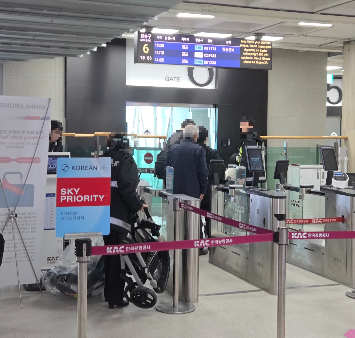 제주 국제공항 국내선 5번 게이트 제주 국제공항에서 출발해 김포 국제공항으로 향하는 대한항공 KE1174편의 탑승은 6번 탑승구에서 진행되었습니다. 제주 국제공항 국내선 청사의 출발층은 매우 붐비는 편입니다. 게이트 사이의 공간이 좁기도 하고, 바로 뒤편에 면세점이 있기도 하다 보니 아주 정신없는 편인데요, 그래서 그런지 미리 탑승 줄을 세워서 탑승하기보다는 탑승이 진행될 때 알아서 눈치껏 줄을 서는 느낌이었습니다. 탑승은 출발 25분 전인 오전 10시 10분부터 시작되었습니다. 가장 먼저 도움이 필요한 승객들이 타는 우선탑승 그룹이 먼저 탑승했고, 뒤이어 프레스티지 클래스 승객, 모닝캄 프리미엄 이상 승객, 스카이팀 엘리트 플러스 승객이 부여받는 스카이 프라이어리티 그룹이 탑승했습니다. 이번 탑승은 프레스티지 클래스를 이용했기에 저도 이 스카이 프라이어리티 그룹 탑승이 진행될 때 탑승할 수 있었습니다.