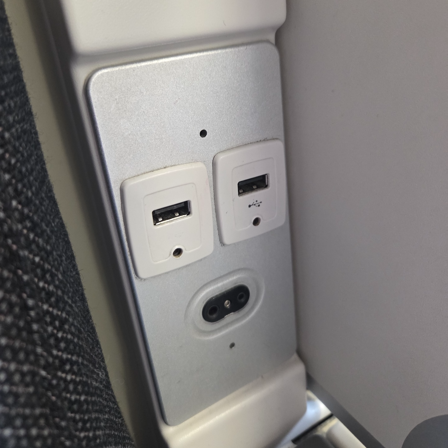 대한항공 A330-300 프레스티지 클래스 충전 포트, 독서등 A열 좌석과 B열 좌석은 얇은 간이 파티션이 있었으며 그 옆으로 UBS-A 충전 포트 2개와 헤드폰 잭이 있었습니다. 헤드폰의 경우 국내선은 탑승 클래스와 관계없이 좌석에 놓여있지 않으며 탑승할 때 비행기 출입구에 놓여져 있는 이어폰을 가져와 사용해야 합니다. 충전 포트 위로는 개인 독서등이 있었으며 독서등은 총 3단계로 조도 조절을 할 수 있었습니다.
