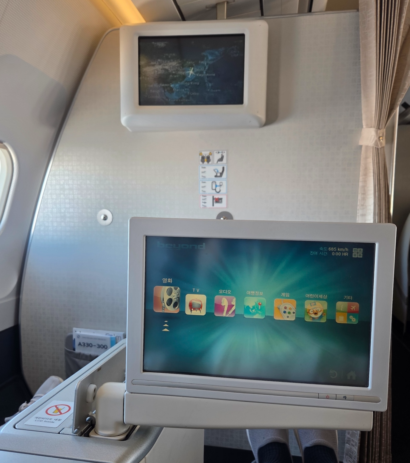 대한항공 A330-300 프레스티지 클래스 벌크헤드 좌석 모니터와 공용 스크린 대한항공 A330-300 프레스티지 슬리퍼 좌석에 설치되어 있는 기내 엔터테인먼트 모니터의 경우 오래되었기에 화질이 좋지는 않습니다. 일반적인 프레스티지 슬리퍼 좌석의 기내 엔터테인먼트 모니터는 앞 좌석 뒤에 설치되어 있기 때문에 탑승객의 눈과 스크린 사이에 최소 1.5m 이상의 거리가 존재해서 모니터가 굉장히 작게 느껴지는 단점이 있는데요, 제가 탑승한 7열 벌크헤드 좌석의 경우 팔걸이 앞 부분에서 모니터를 빼서 쓰는 방식이기에 모니터가 눈앞에 가까이 위치해서 상대적으로 모니터가 커 보인다는 장점이 있었습니다. 물론, 이 방식의 모니터는 택싱 중이나 이륙, 착륙 중에는 사용할 수 없다는 단점도 있지만, 대한항공의 경우 공용 모니터가 있고, 이 모니터로 세이프티 비디오와 비행지도를 보여주기 때문에 이 단점이 상당 부분 상쇄되는 효과가 있습니다. (다만, 이 모니터의 경우 음료 서비스가 끝나면 함께 꺼집니다) 또한 모니터가 가까이 있다 보니 다른 좌석과 달리 리모컨 대신 터치 방식으로 컨트롤하는 게 더 편하기도 했습니다.
