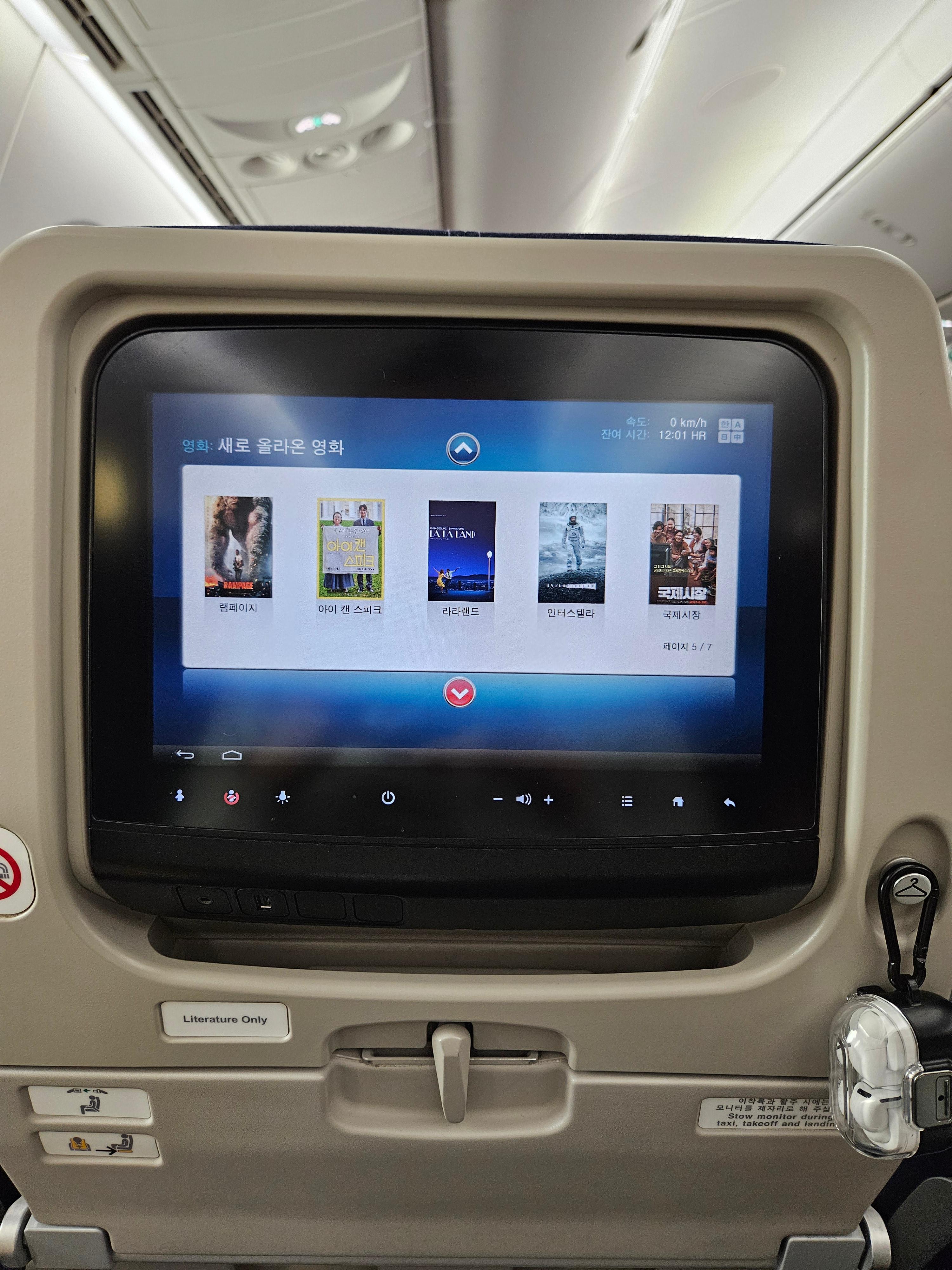 대한항공 B787-9 기내 엔터테인먼트 시스템 다양한 항공사들을 이용해 보며 항상 정말 만족하기 어려운 부분이 바로 기내 엔터테인먼트인데요, 아마도 제가 한국인이기 때문이 아닐까 싶습니다. 아무래도 대부분의 항공사가 자국의 영화와 할리우드 영화를 기본으로 각국의 영화를 조금씩 추가하기 때문인데요, 그런 면에서 대한항공의 기내 엔터테인먼트는 제게 많이 만족스러웠습니다. 한국 영화가 많았기에 오랜만에 한국 영화들을 많이 볼 수 있었기 때문인 것 같습니다. 다양한 한국 영화들과 TV 쇼가 탑재되어 있는 게 대한항공 기내 엔터테인먼트의 가장 큰 장점입니다. 대한항공 기내 엔터테인먼트 시스템을 통해 다양한 영화, TV프로그램, 에어쇼 등을 볼 수 있고 도착지 공항의 정보, 입국 정보도 확인할 수 있습니다. 아쉬웠던 점은 게임 항목이 있음에도 아무 게임도 없었던 것이 조금 아쉬웠습니다. 다른 아쉬웠던 점이라면 외부 카메라가 없었다는 점인데 이건 B787 항공기에서 기본적으로 제공하는 기능은 아니기에 어쩔 수 없는 부분인 것 같고요, 여전히 기내 와이파이 지원도 안된다는 건 더 큰 아쉬운 점입니다.