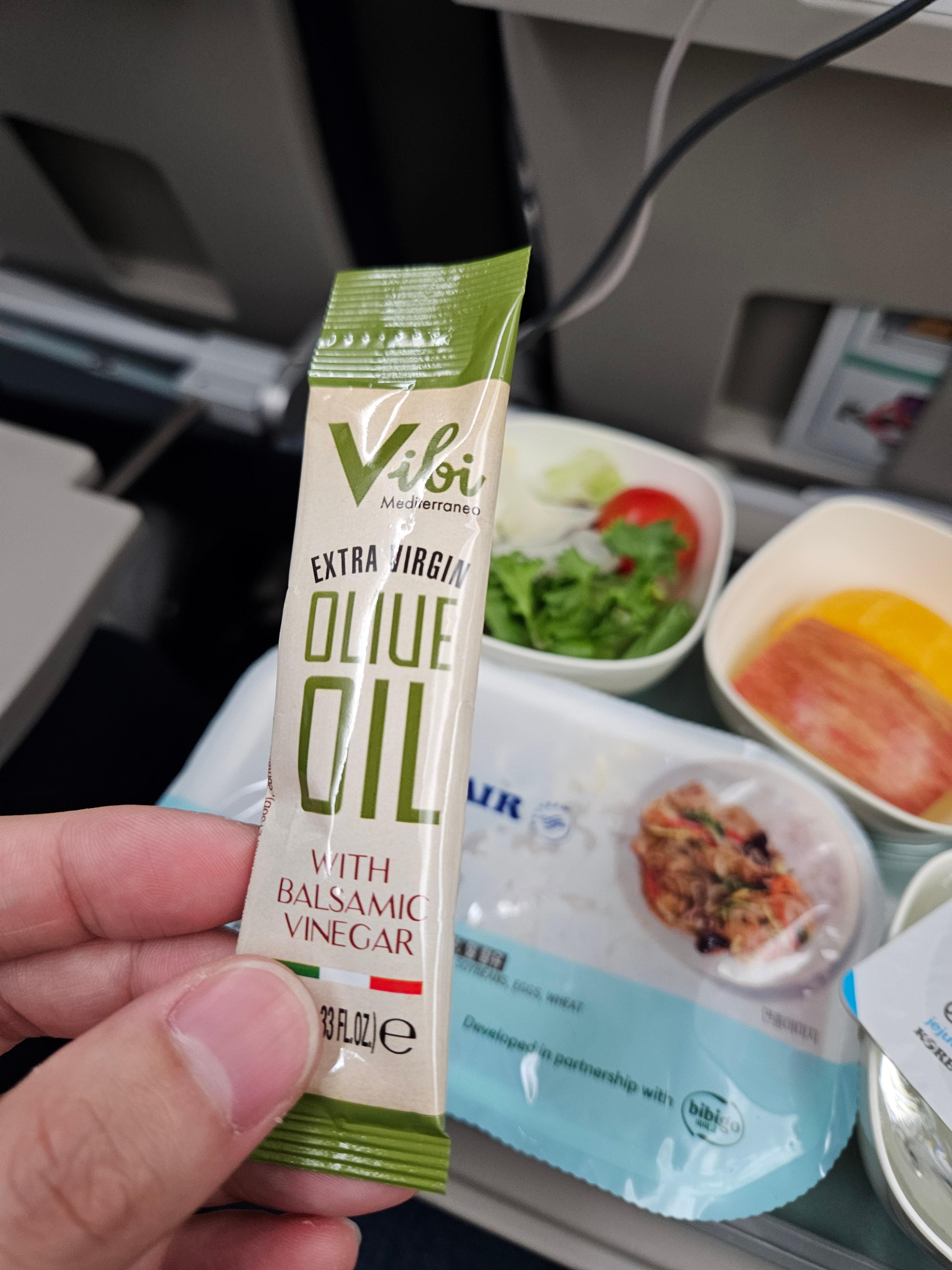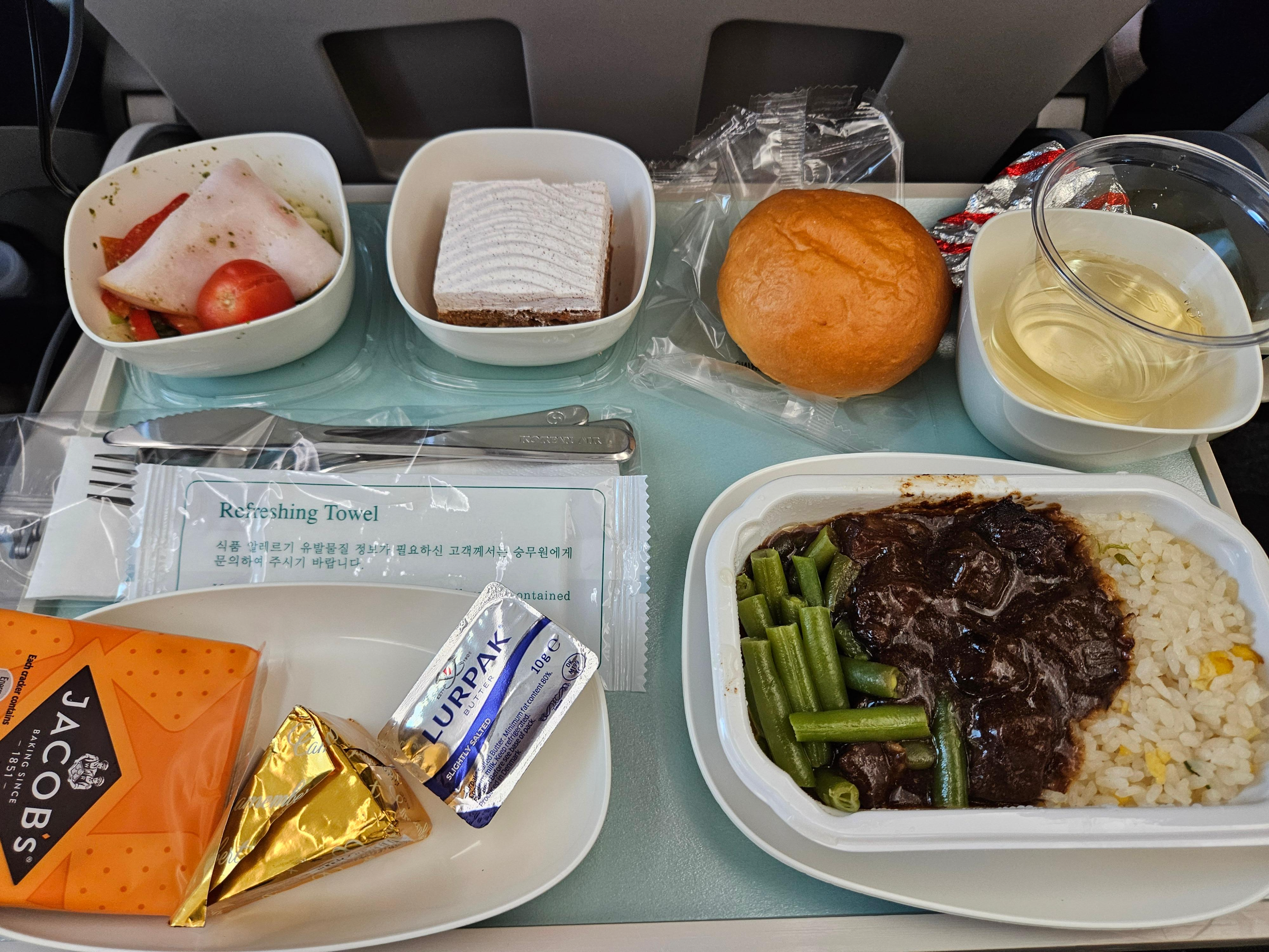 대한항공 KE32편 이코노미 클래스 이륙 후 기내식 이륙 직후에 나오는 기내식은 중국식 소고기(오향장육), 된장 덮밥, 매운맛 가지 볶음의 3개의 선택지가 있었고, 저는 중국식 소고기를 선택했습니다. 중국식 소고기는 모닝빵과 버터, 햄과 바질 드레싱이 들어간 샐러드, 그린 빈과 큐브 형태의 소고기가 중국식 향신료가 들어간 소스, 밥과 제공되는 메인, 디저트로는 ekdrms 케이크와 비스킷, 치즈가 제공되었습니다. 모닝빵은 특별할 것 없는 모닝빵이었지만 함께 제공된 가염버터와 먹으니 괜찮았고, 바질 드레싱이 들어간 샐러드는 괜찮았습니다. (닭고기 샐러드라고 되어 있는 걸 보아 닭고기 햄일 수도 있겠네요.) 메인인 중국식 소고기는 중국풍의 향신료가 들어가 있어 호불호가 있을 것 같지만 전 맛있었고요, 다만 그린빈의 식감은 물컹해서 약간 아쉬웠습니다. 디저트인 케이크는 그냥 빵에 크림이 올라간 평범한 케이크였고, 비스킷도 특별할 것 없었습니다. 치즈는 까망베르 치즈였는데 제가 선택한 화이트 와인과 먹기 좋았습니다. 일행은 된장 덮밥을 주문했는데 미역국과 오란다, 오이지무침이 나왔고, 된장은 약간은 자작한 강된장 같은 스타일이라 짭조름해서 기내식으로 먹기 좋은 맛이었습니다.