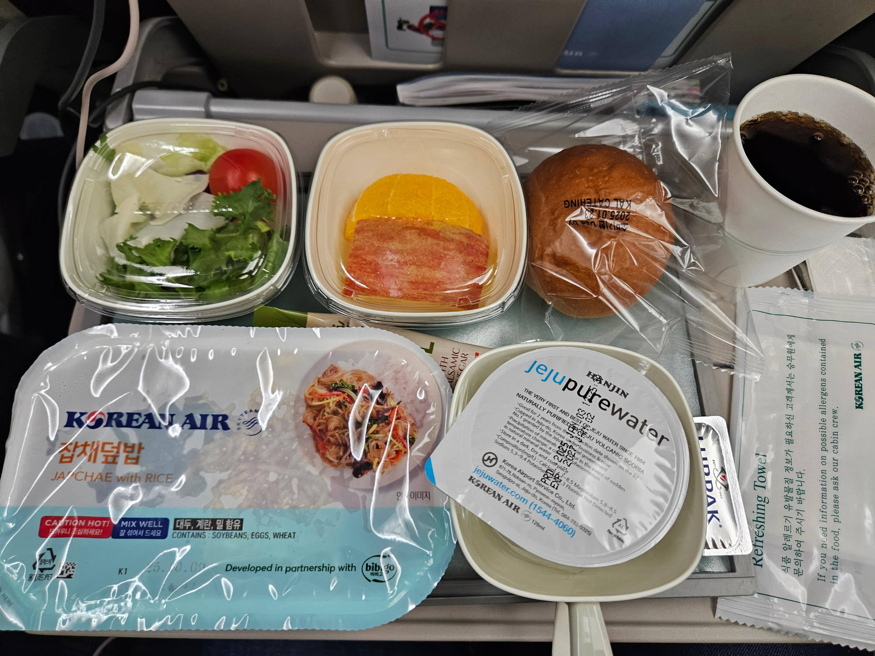 대한항공 KE32편 이코노미 클래스 착륙 전 기내식 마지막 기내식은 잡채밥과 토마토 파스타의 2가지의 선택지가 있었습니다. 착륙시간대 기준으로 아침인데도 아침 식사가 아니라 신기했습니다. 저는 잡채밥을 선택했습니다. 잡채밥은 발사믹 소스가 들어간 샐러드, 모닝빵과 버터, 과일이 함께 제공되었습니다. 잡채밥의 잡채에 들어가는 야채 고명이 아주 가지런히 올려져 있는 게 에쁘더라고요. 잡채밥도 맛있었습니다.
