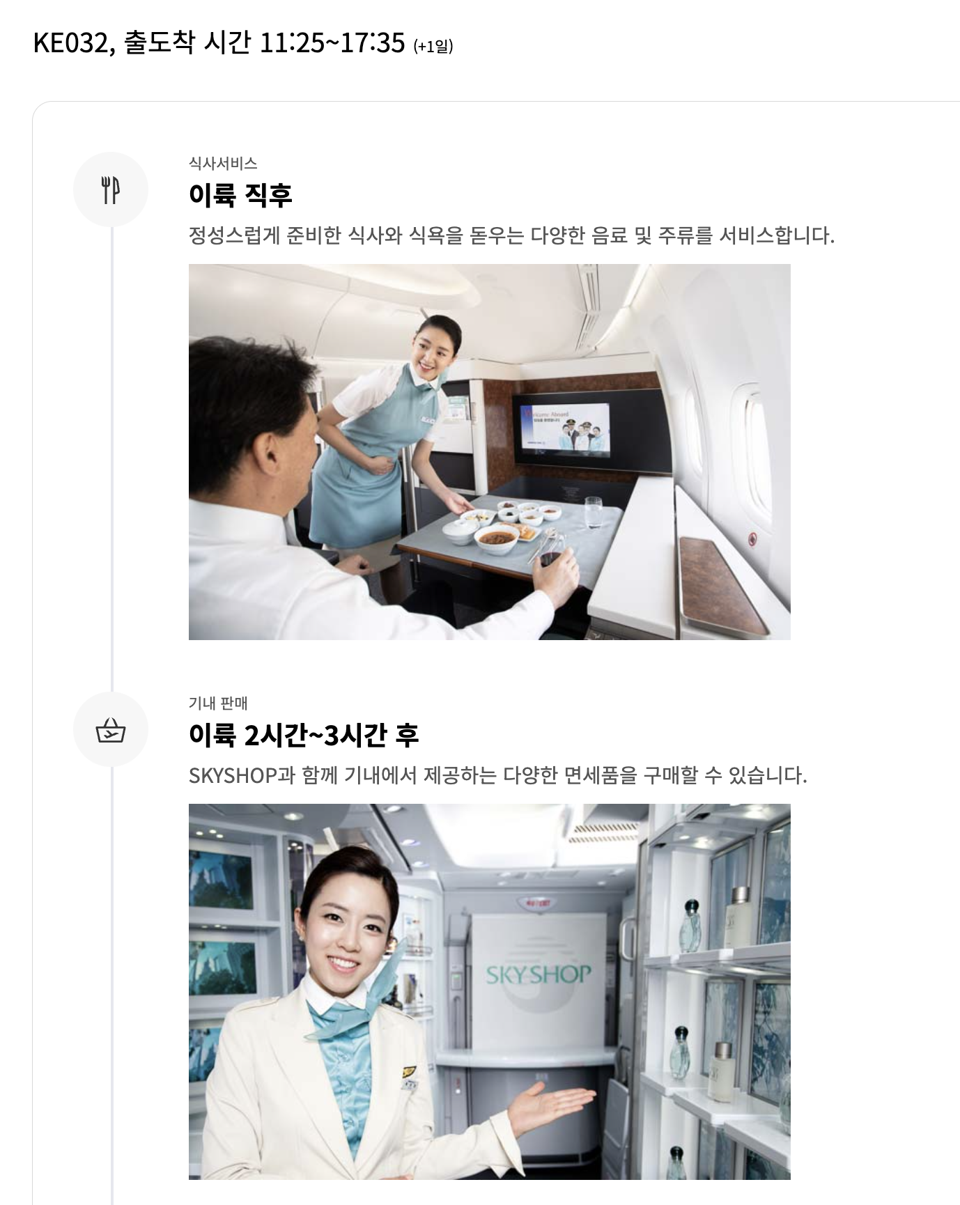 대한항공 KE32편 기내 서비스 순서 기내 서비스 타임라인은, 이륙 직후 1시간 내로 기내식이 제공되고, 기내식 후에 바로 면세품 판매가 이루어집니다. 다만, 면세품 판매는 이 시간 이후에도 승무원에게 요청하면 구입할 수 있습니다. 이륙 6시간 후, 절반 정도 왔을 때는 간식과 음료가 제공되고, 착륙 2시간 전에는 마지막 기내식이 제공되었습니다.