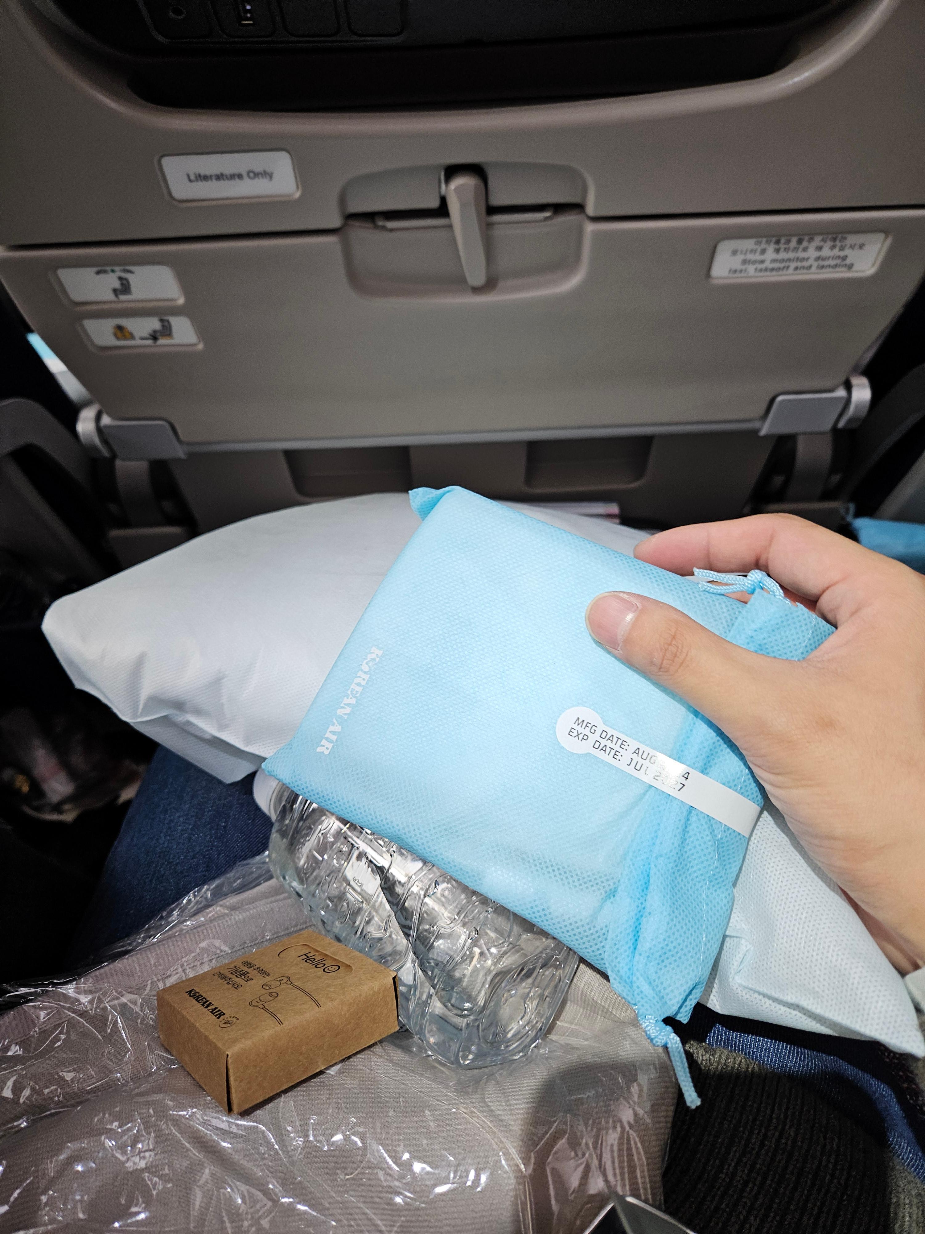 대한항공 장거리 이코노미 클래스 어매니티 대한항공은 이코노미 클래스에도 간단한 어매니티를 제공합니다. 바로 슬리퍼와 칫솔이 담긴 하늘색의 부직포 파우치입니다. 슬리퍼의 경우 아주 얇은 재질로 되어 있고, 칫솔의 경우 미세모 칫솔입니다. 담요와 생수 한 병, 얇은 베개와 이어폰도 제공이 됩니다. 이것들은 기본적으로 탑승 시에 좌석에 비치가 되어 있고요, 이 외에도 화장실에는 탈취제, 얼굴에 바를 수 있는 에센스와 핸드 솝이 비치되어 있습니다.