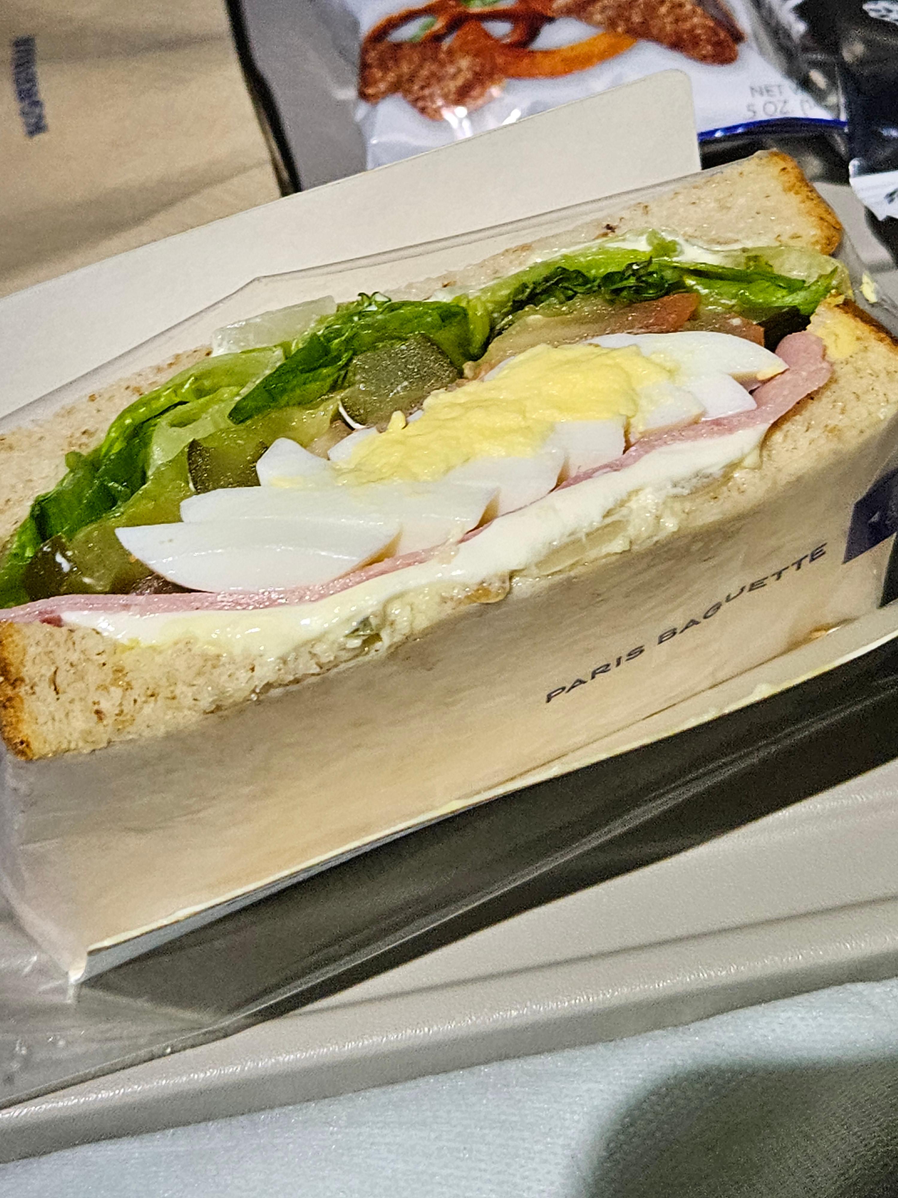 대한항공 KE32편 이코노미 클래스 간식과 맥주 간식으로는 핫도그가 서빙되었습니다. 약 절반정도 왔을 때 모든 승객에게 서비스가 되었고요, 이 핫도그는 평범한 돼지고기 소시지가 들어간 핫도그였는데 오뚜기 케첩 발라 먹으니까 맛있더라고요. 비행기 안에서 유독 맛있는 음식들이 있는데 케첩을 뿌린 핫도그도 그중 하나였던 것 같습니다. 셀프서비스 바에는 햄과 계란이 들어간 샌드위치가 준비되어 있었고, 믹스 너트와 다이제 비스킷도 준비되어 있었습니다. 샌드위치는 파리 바게트에서 납품받는 것 같은데 나름 알찬 샌드위치였습니다.