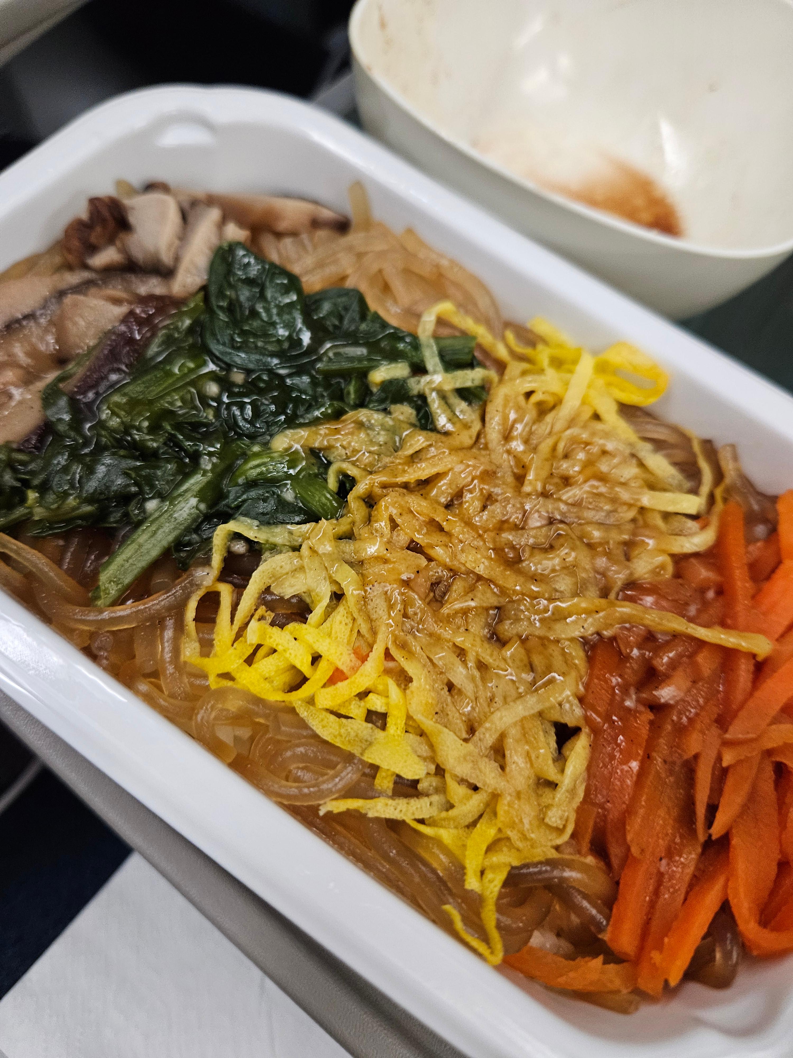 대한항공 KE32편 이코노미 클래스 착륙 전 기내식 마지막 기내식은 잡채밥과 토마토 파스타의 2가지의 선택지가 있었습니다. 착륙시간대 기준으로 아침인데도 아침 식사가 아니라 신기했습니다. 저는 잡채밥을 선택했습니다. 잡채밥은 발사믹 소스가 들어간 샐러드, 모닝빵과 버터, 과일이 함께 제공되었습니다. 잡채밥의 잡채에 들어가는 야채 고명이 아주 가지런히 올려져 있는 게 에쁘더라고요. 잡채밥도 맛있었습니다.