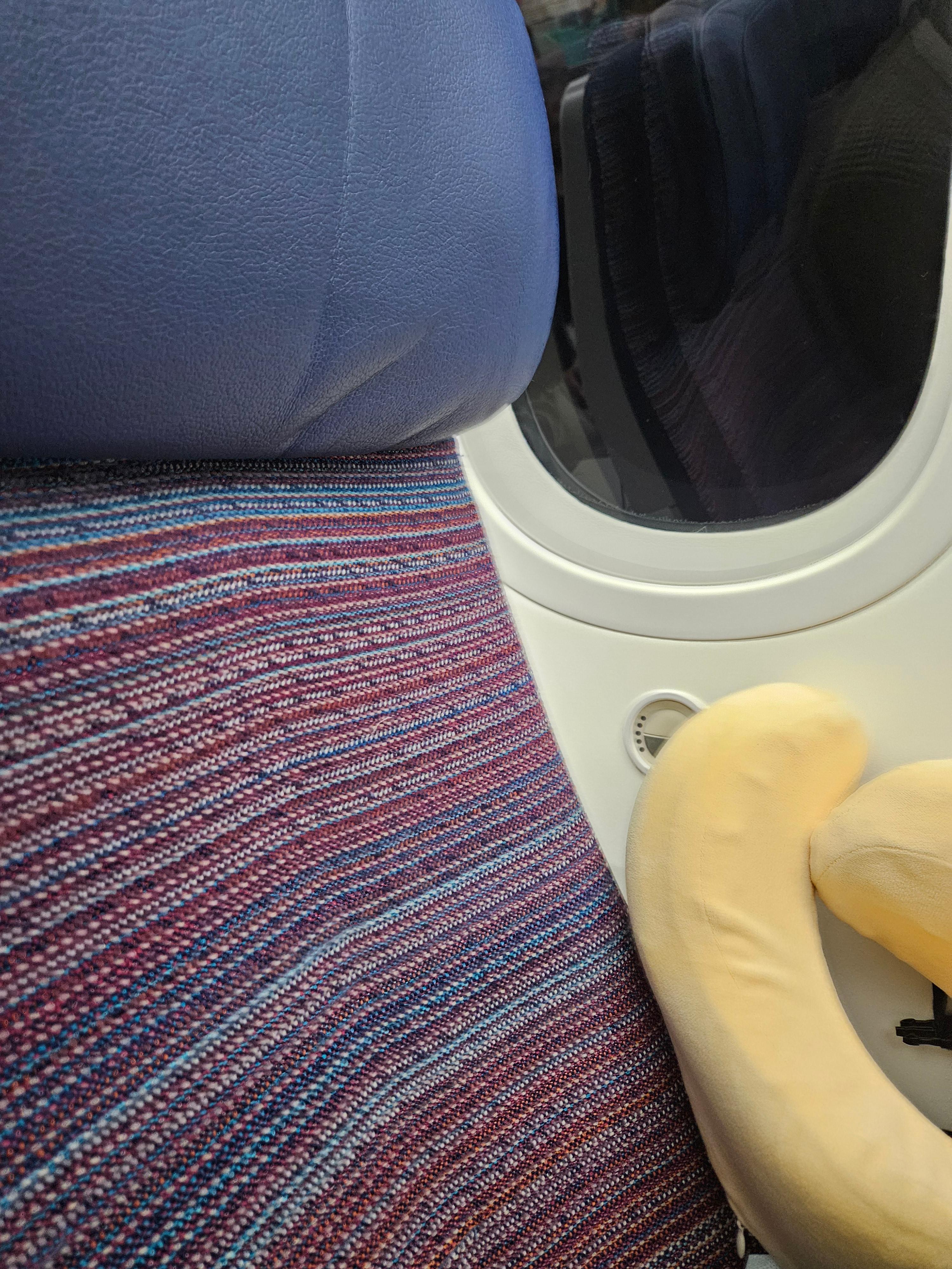 대한항공 B787-9 시트 색상과 기내 제가 앉은 좌석은 34B로 가운데에 위치한 좌석이었습니다. 함께 여행한 동반인은 제 옆인 34A 앉았고요. 제가 탑승한 B787-9는 대한항공이 초기에 들여온 B787-9 기체로 원래는 이코노미 클래스가 245석이 설치되어 있었는데요, 2024년 4월에 기내 인테리어를 바꾸면서 이코노미 클래스가 254석으로 바뀐 기체입니다. 설치된 좌석이 늘어나며 기존 33인치였던 이코노미 클래스 좌석 간격도 32인치로 1인치가 줄어든 것으로 알려져 있습니다. 기내 좌석 배치를 바꾸면서 좌석 색상도 바꿨는데요, 기존의 짙은 파란색과 갈색이었던 좌석들이, 이제는 어떤 색이라고 말하기 어려운 푸른색과 붉은색이 함께 섞인 색상으로 바뀌었습니다. 다만 기내 좌석 프로덕트가 바뀐 건 아니라 어떤 분들은 이걸 ‘천갈이’라고 표현하시기도 합니다.