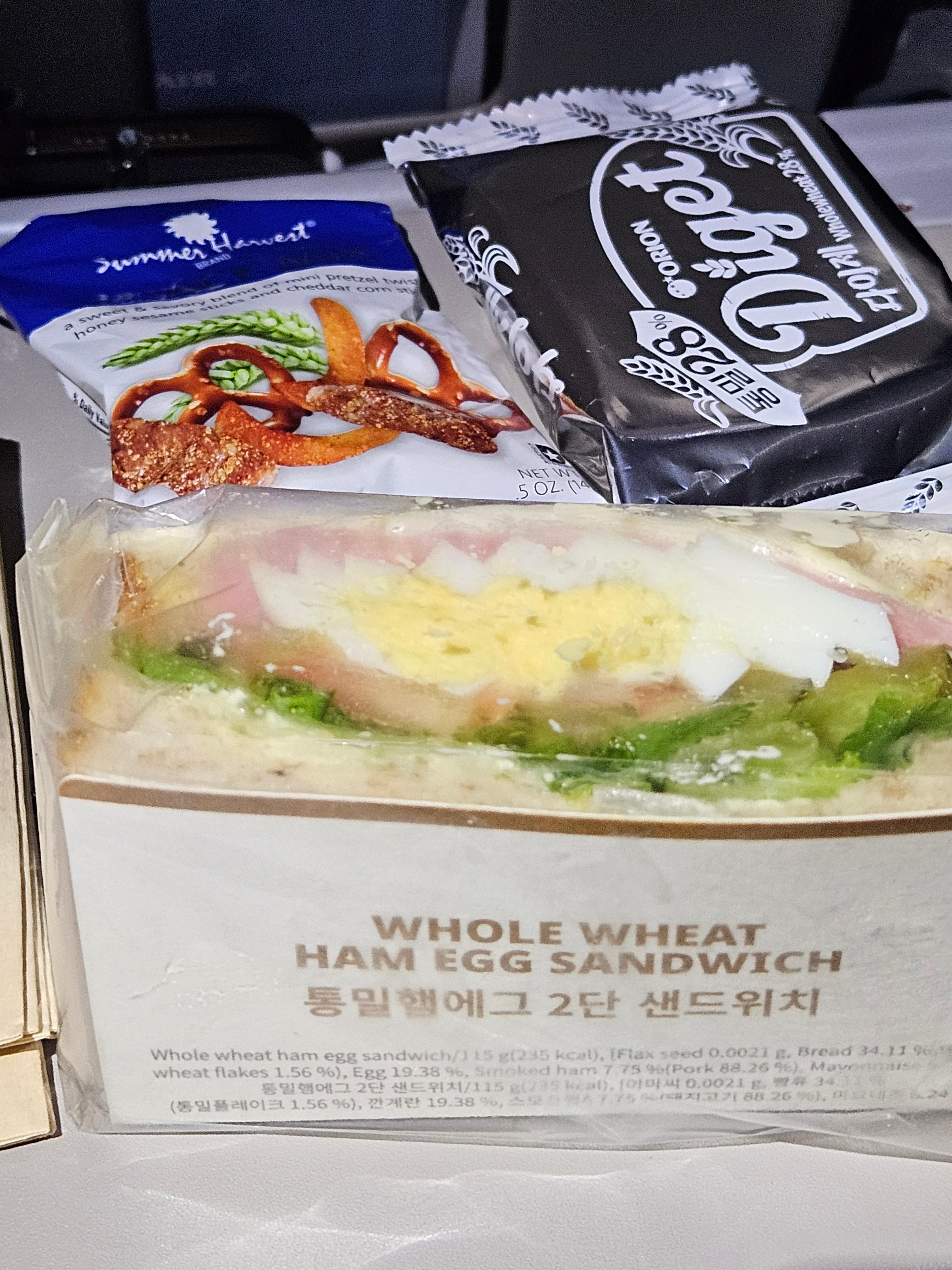 탑승시에는 제공되지 않는 대한항공 KE32편 이코노미 클래스 기내식 메뉴 전반적으로 꽤 괜찮은 기내식이었습니다. 기내식이기에 양이 아주 많지는 않았지만, 그래도 간식거리들이 괜찮게 준비되어 있어 배가 고프지 않았습니다. 새롭게 추가된 샌드위치도 나쁘지 않았지만 여전히 컵라면이 조금 아쉽긴 합니다.