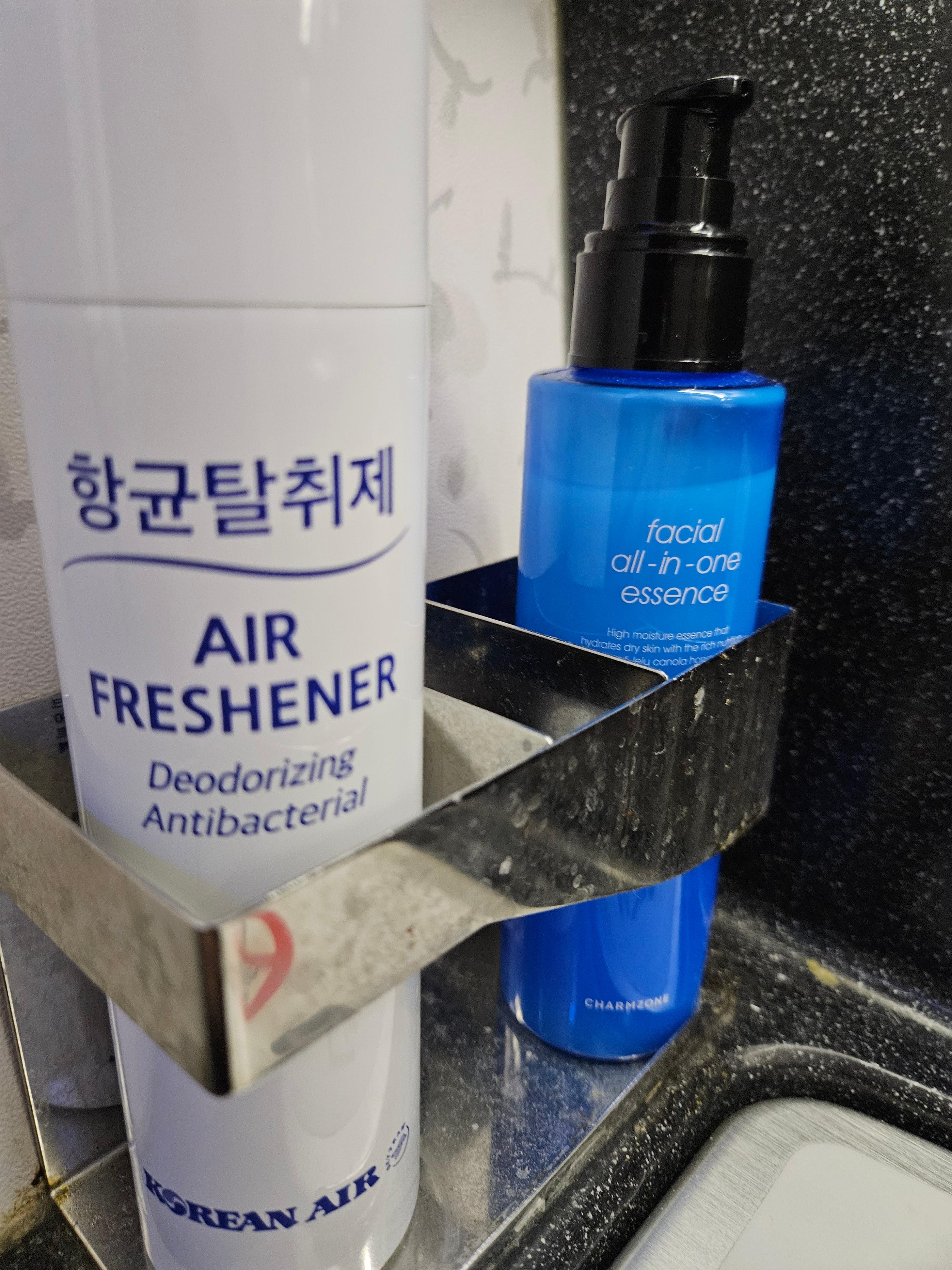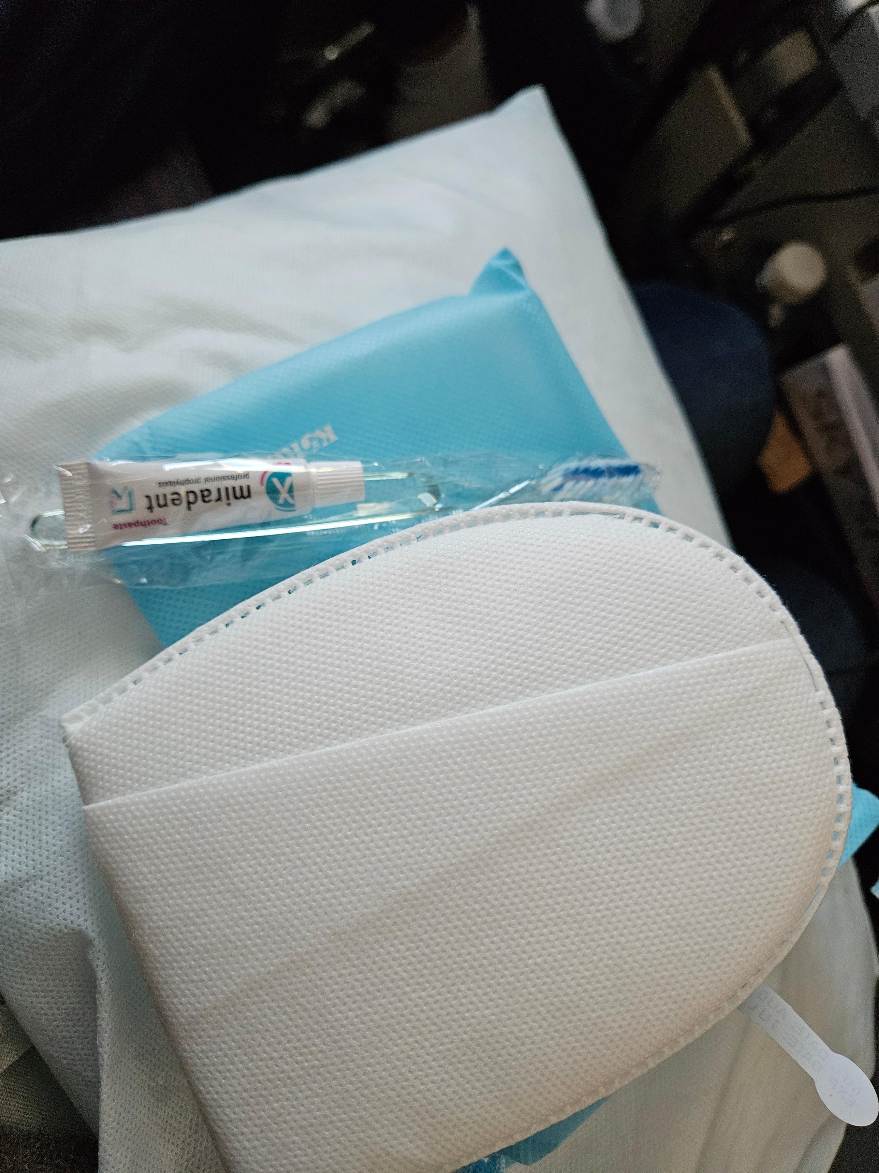 대한항공 장거리 이코노미 클래스 어매니티 대한항공은 이코노미 클래스에도 간단한 어매니티를 제공합니다. 바로 슬리퍼와 칫솔이 담긴 하늘색의 부직포 파우치입니다. 슬리퍼의 경우 아주 얇은 재질로 되어 있고, 칫솔의 경우 미세모 칫솔입니다. 담요와 생수 한 병, 얇은 베개와 이어폰도 제공이 됩니다. 이것들은 기본적으로 탑승 시에 좌석에 비치가 되어 있고요, 이 외에도 화장실에는 탈취제, 얼굴에 바를 수 있는 에센스와 핸드 솝이 비치되어 있습니다.