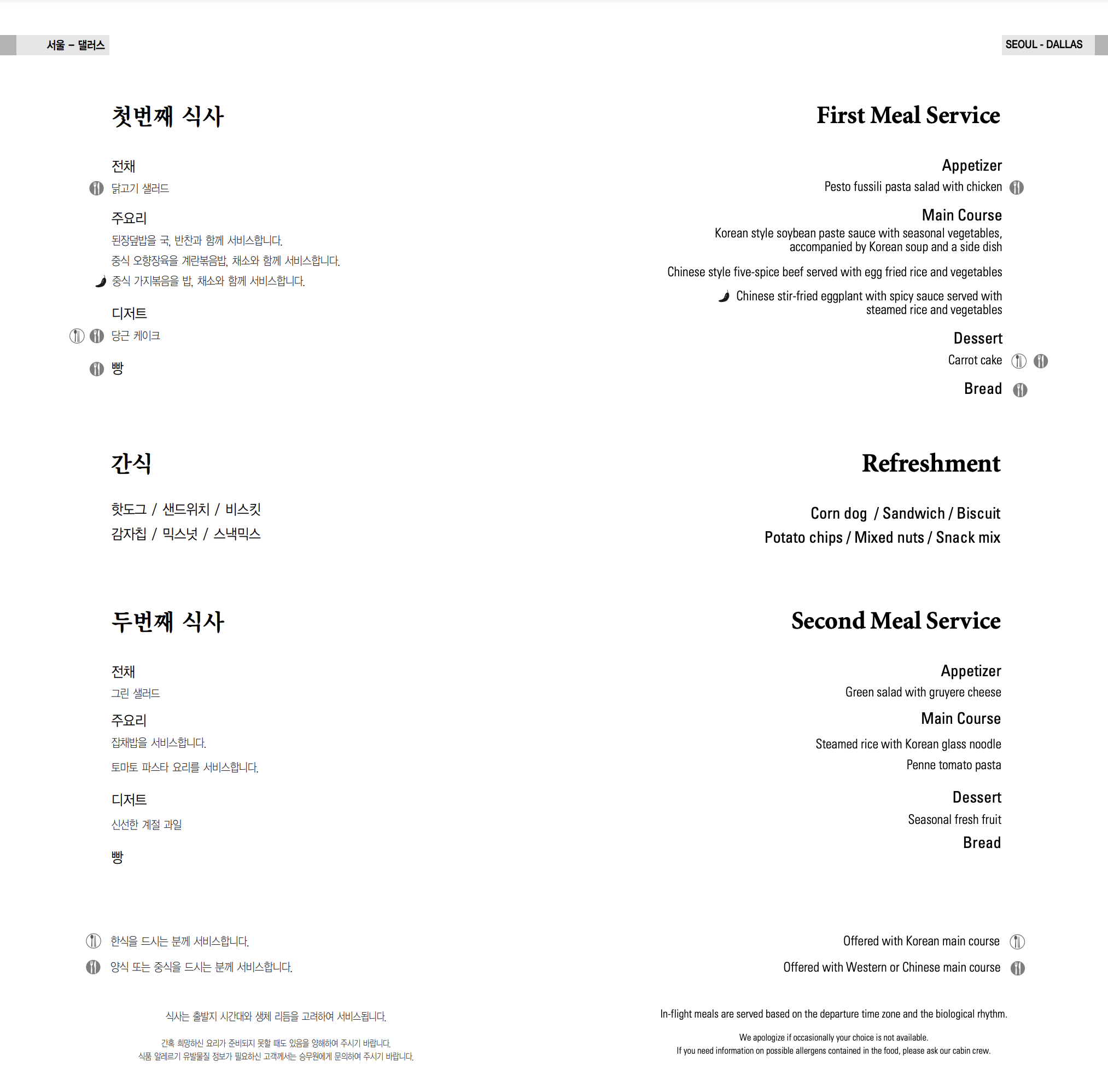 대한항공의 인천 → 댈러스 노선은 대한항공의 미주행 노선 중에서도, 아틀랜타, 워싱턴 DC와 함께 가장 긴 노선 중 하나입니다. 따라서 기내식이 2번 간식은 1번 제공됩니다. 이외에도 기내식과 간식 사이에 승객이 자율적으로 이용할 수 있는 셀프서비스 바가 설치되어 있습니다. 대한항공의 기내식 서비스는 식사와 음료가 한 번에 제공되는 형태고, 식사와 음료를 처음 서빙한 후, 와인은 들고 다니시면서 한번 더 제공을 하고, 후에 커피와 티 서비스를 제공하고 기내식 트레이를 치우는 형태로 제공이 됩니다. 음료나 주류는 비행 중 승무원에게 요청하면 언제든지 받을 수 있고, 간단한 음료는 셀프서비스 바에서도 이용할 수 있습니다.