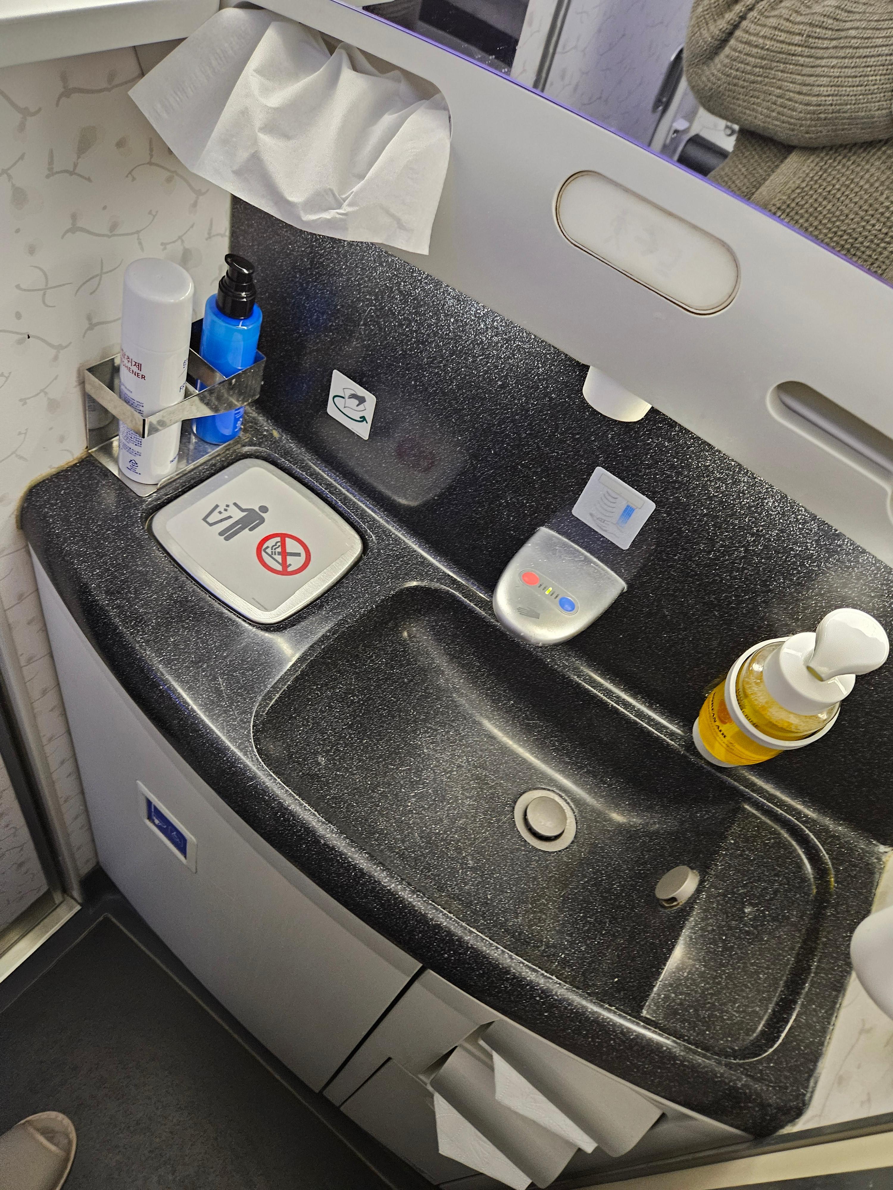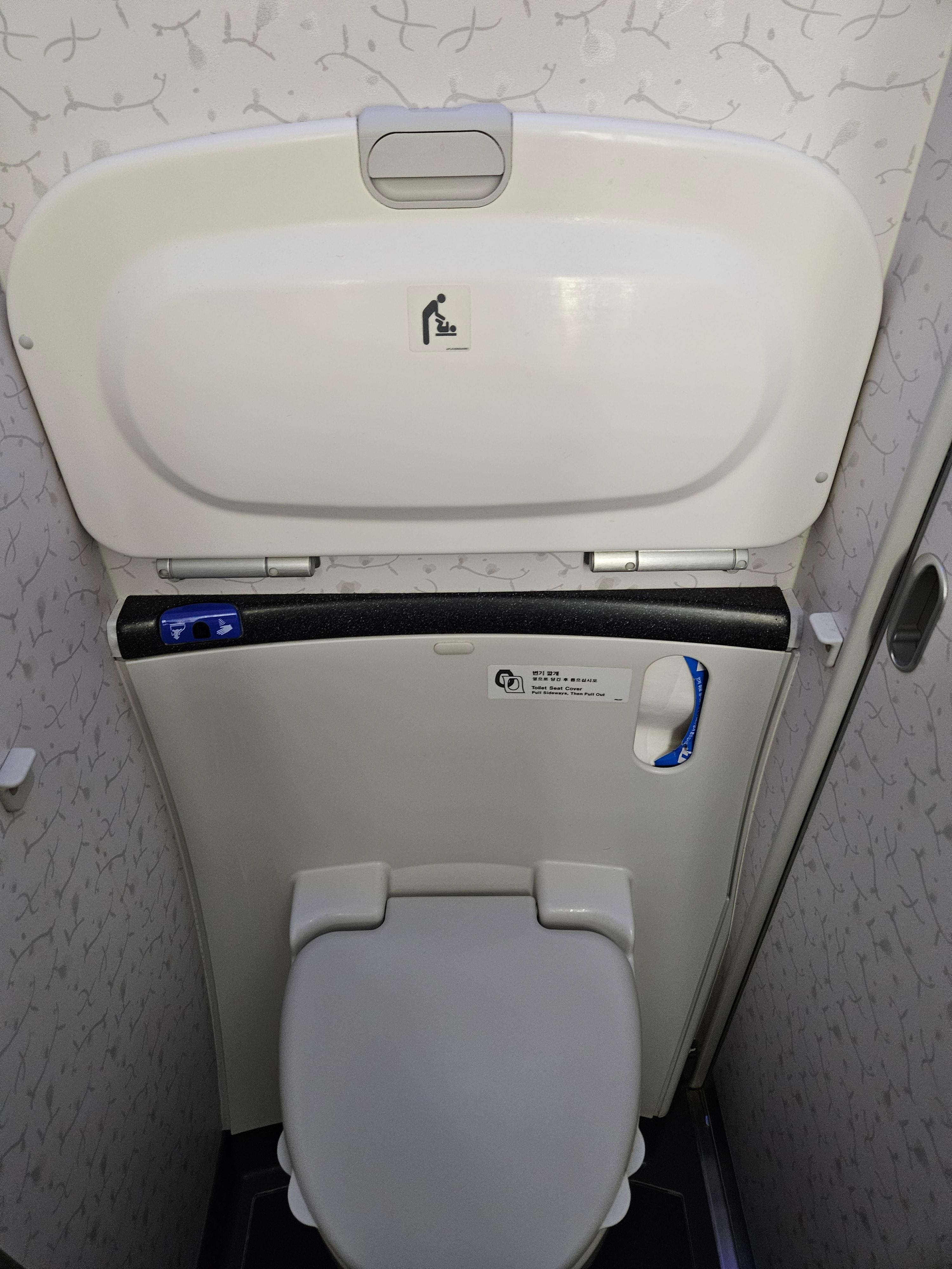 대한항공 B787-9 이코노미 클래스 화장실 화장실의 경우 이코노미 클래스 캐빈 앞에 설치된 두 개의 화장실은 프레스티지 클래스 전용으로 지정되어 있어 이용할 수 없습니다. 이용할 수 없음에도 화장실 이용 안내등은 이코노미 클래스에도 설치되어 있어, 프레스티지 클래스 이용객들의 화장실 이용 상황을 알 수 있었습니다.. 이코노미 클래스용 화장실은 중앙에 4개 후방에 2개가 설치되어 있었고, 기본적인 형태의 화장실이었습니다. 화장실의 경우 기내식 서비스 직후에는 많이 붐비는 편입니다.