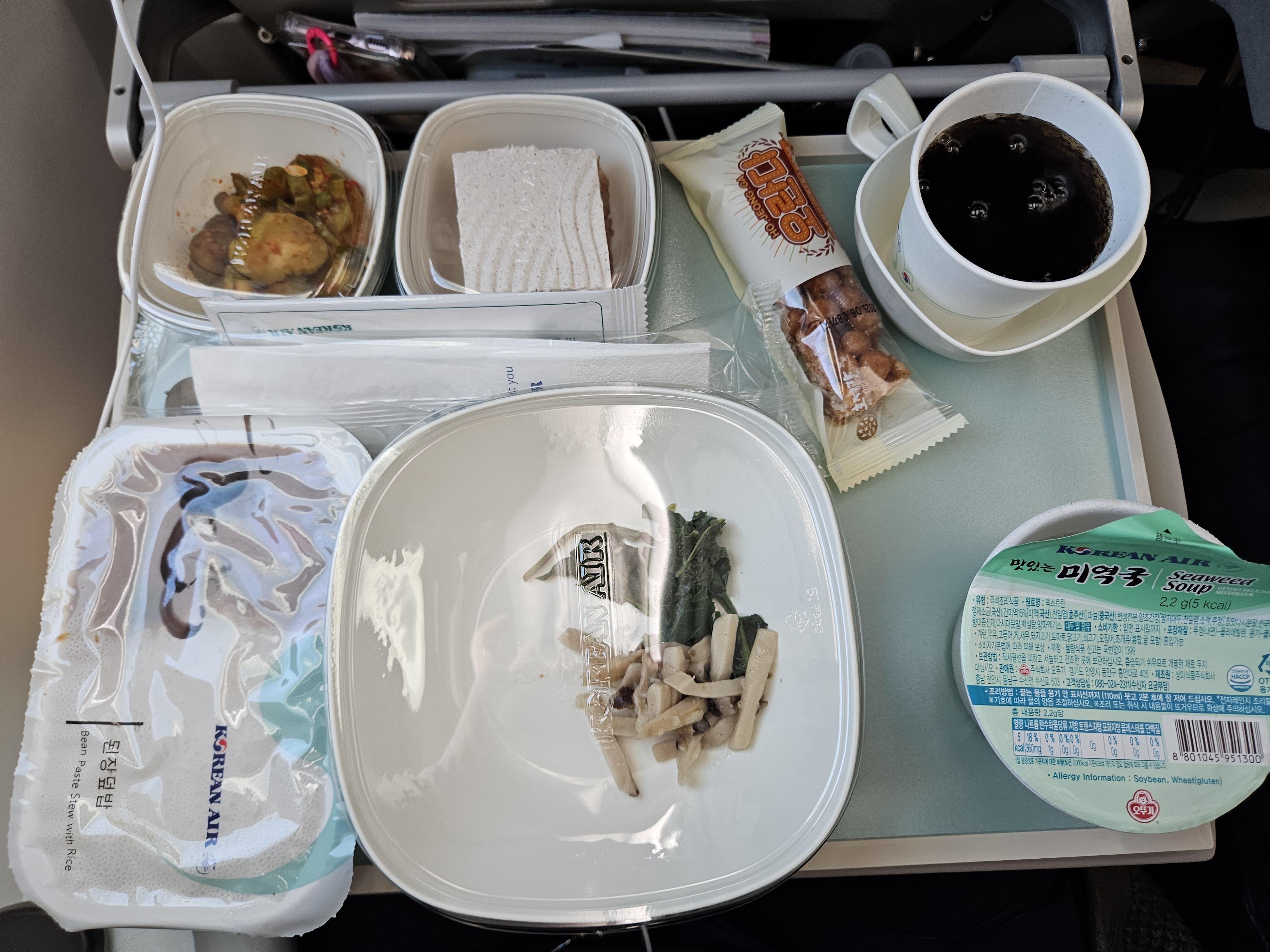 대한항공 KE32편 이코노미 클래스 이륙 후 기내식 이륙 직후에 나오는 기내식은 중국식 소고기(오향장육), 된장 덮밥, 매운맛 가지 볶음의 3개의 선택지가 있었고, 저는 중국식 소고기를 선택했습니다. 중국식 소고기는 모닝빵과 버터, 햄과 바질 드레싱이 들어간 샐러드, 그린 빈과 큐브 형태의 소고기가 중국식 향신료가 들어간 소스, 밥과 제공되는 메인, 디저트로는 ekdrms 케이크와 비스킷, 치즈가 제공되었습니다. 모닝빵은 특별할 것 없는 모닝빵이었지만 함께 제공된 가염버터와 먹으니 괜찮았고, 바질 드레싱이 들어간 샐러드는 괜찮았습니다. (닭고기 샐러드라고 되어 있는 걸 보아 닭고기 햄일 수도 있겠네요.) 메인인 중국식 소고기는 중국풍의 향신료가 들어가 있어 호불호가 있을 것 같지만 전 맛있었고요, 다만 그린빈의 식감은 물컹해서 약간 아쉬웠습니다. 디저트인 케이크는 그냥 빵에 크림이 올라간 평범한 케이크였고, 비스킷도 특별할 것 없었습니다. 치즈는 까망베르 치즈였는데 제가 선택한 화이트 와인과 먹기 좋았습니다. 일행은 된장 덮밥을 주문했는데 미역국과 오란다, 오이지무침이 나왔고, 된장은 약간은 자작한 강된장 같은 스타일이라 짭조름해서 기내식으로 먹기 좋은 맛이었습니다.