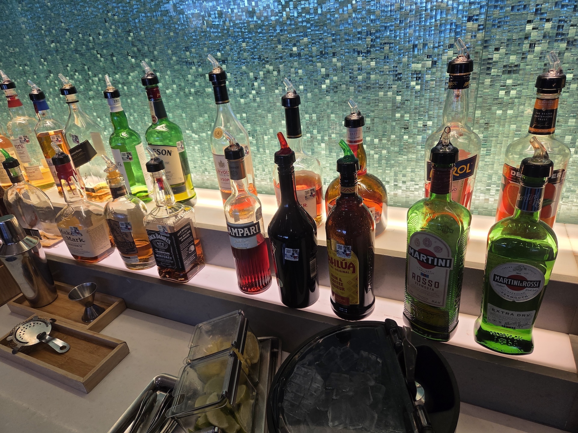 댈러스 포트워스 공항 아메리칸 항공 플래그십 라운지 주류 제공되는 주류도 아메리칸 항공의 다른 라운지 네트워크인 애드미럴스 클럽보다 다양한 편입니다. 주류는 오픈바 형태로 제공되어서 원하는 만큼 알아서 마시는 형태입니다. 레드와인과 화이트 와인, 샴페인으로는 볼린저가 제공됩니다. 도수가 높은 술들은 미국에서 기본적으로 많이 마시는 거의 모든 술들이 있다고 보시면 되는데 싱글몰트 스카치로는 더 글렌리벳과 글렌피딕, 발베니, 블렌디드로는 조니워커 블랙, 아이리시 위스키로는 제임슨이 있으며, 버번으로는 메이커스 마크와 잭 다니엘스, 진으로는 헨드릭스와 봄베이 사파이어, 테킬라로는 페트론과 카사미고스 등이 있습니다. 이 외에도 전자동 에스프레소 머신, 다양한 탄산음료를 선택해서 마실 수 있는 탄산음료 기계 등이 있고 특히 물은 캔 형태로 제공되어 비행기에 탑승하기 전 한두 개 챙겨가기에 좋습니다.