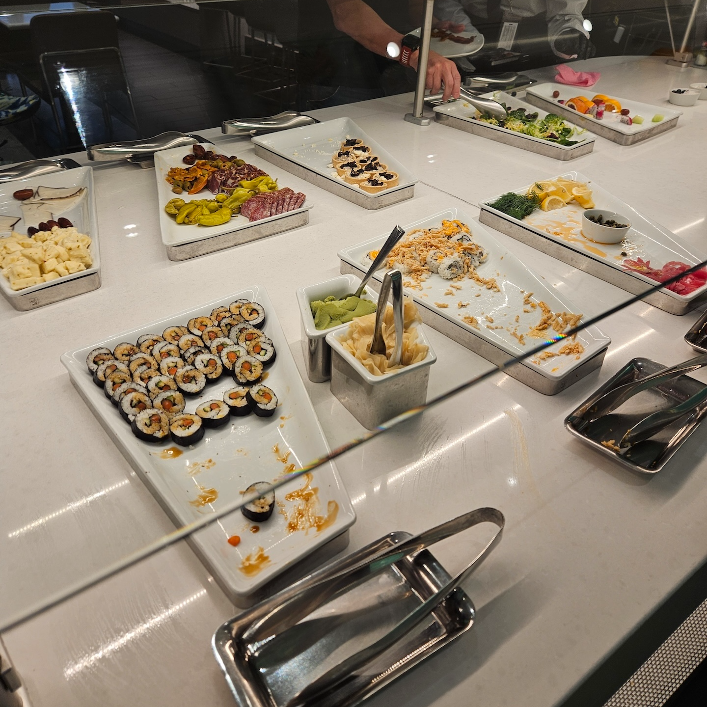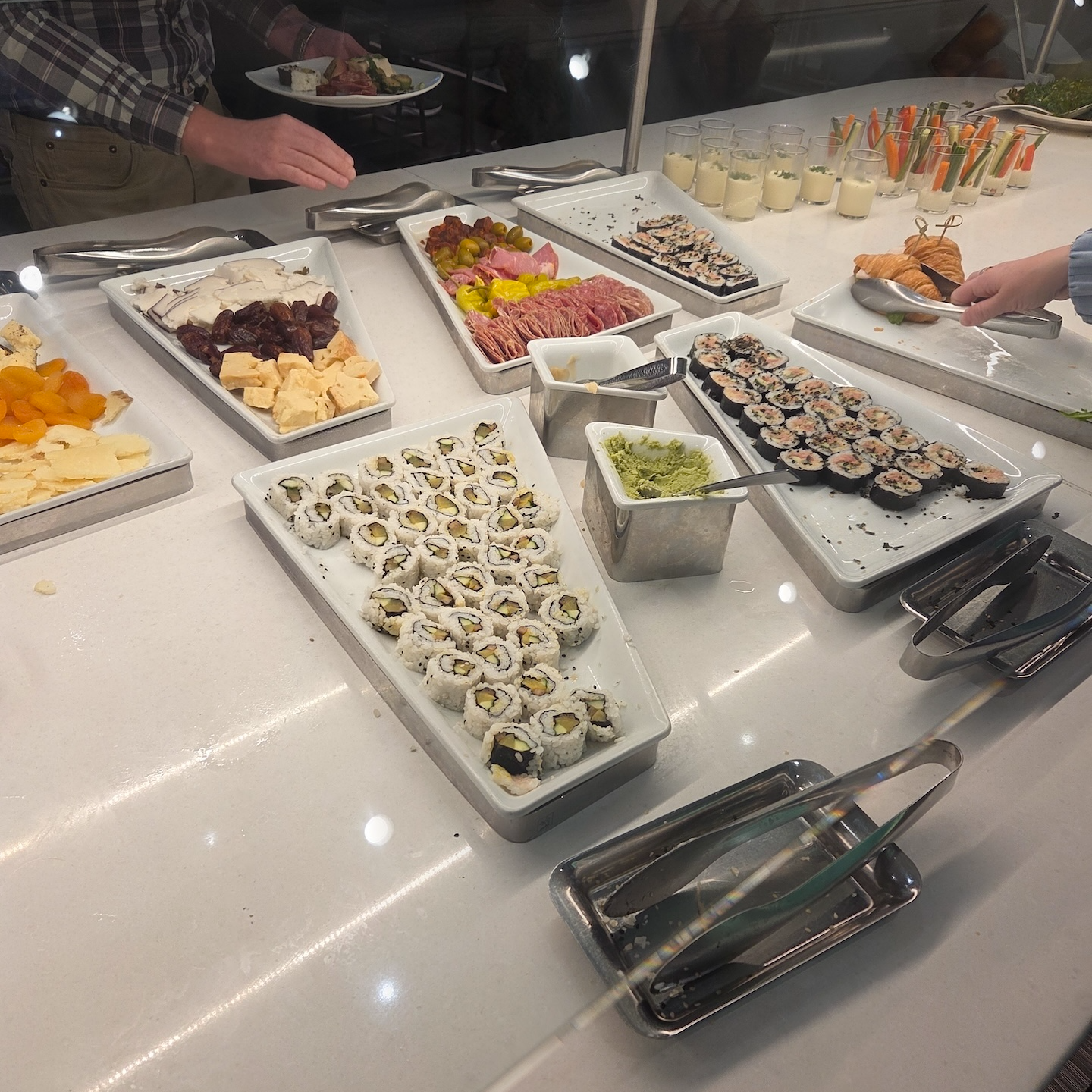 댈러스 포트워스 공항 아메리칸 항공 플래그십 라운지 점심/저녁 메뉴 2 점심과 저녁시간대에는 아침 메뉴인 베이컨이나 소시지 대신 다른 핫 푸드가 들어옵니다. 일반적으로 생선요리, 구운 고구마, 감자, 방울 양배추 등의 야채 요리를 비롯해 캘리포니아 롤이나 포케가 제공되기도 하고요, 크로와상 샌드위치와 같은 샌드위치류, 샐러드와 과일, 수프, 샤퀴테리와 치즈, 누들바 등이 운영됩니다. 이런 메뉴들은 항상 고정적으로 제공되지는 않고 계절과 상황에 따라서 유동적으로 바뀌는 편이지만 전반적인 구성은 비슷한 편입니다.