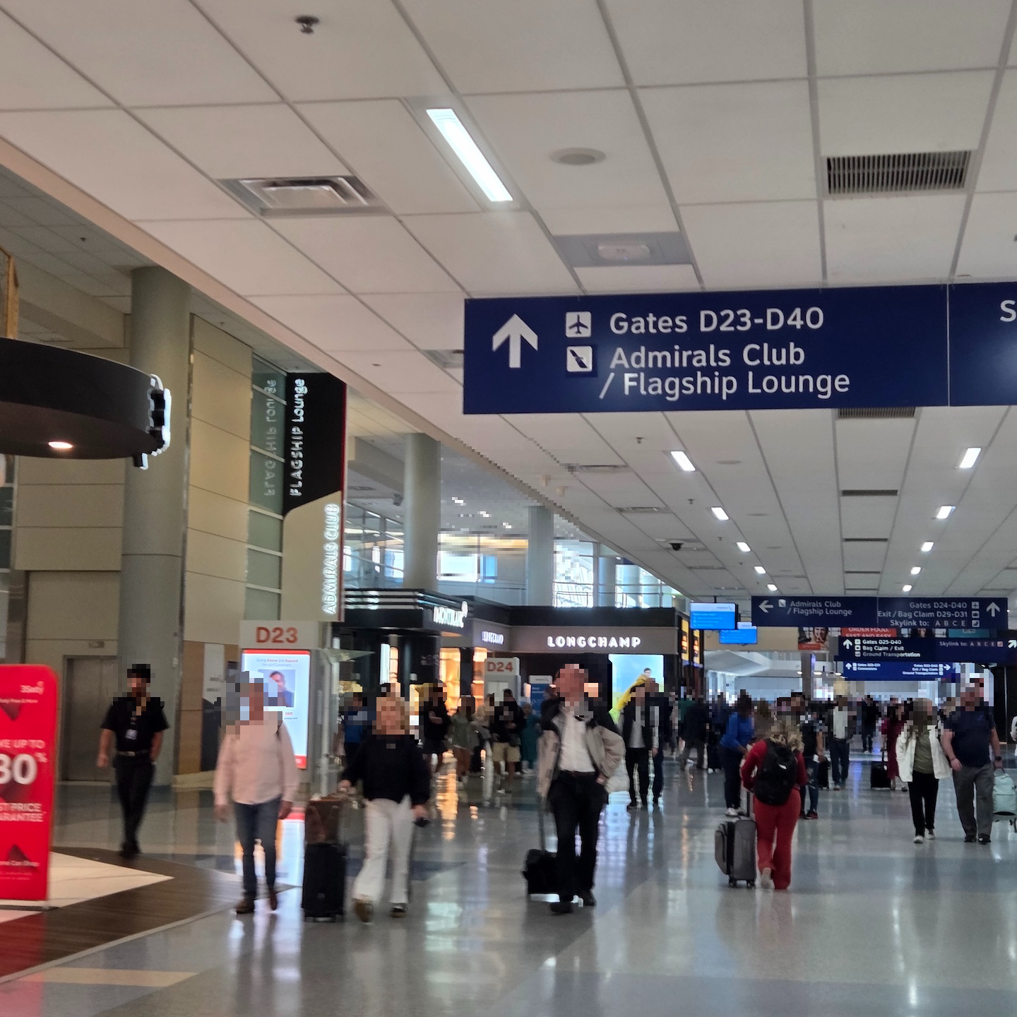 댈러스 포트워스 공항의 아메리칸 항공 플래그십 라운지 입구와 초대권 참고로, 원래 댈러스 포트워스 공항의 아메리칸 항공 플래그십 라운지는 캐피탈 원 라운지와 같이 D22번 게이트에 있었습니다. 하지만 캐피탈 원 라운지 과부하로 인해 출입구가 혼잡해지는 문제가 있어 2025년 하반기부터 D23번 게이트 근처로 플래그십 라운지 출입구를 조정했습니다.