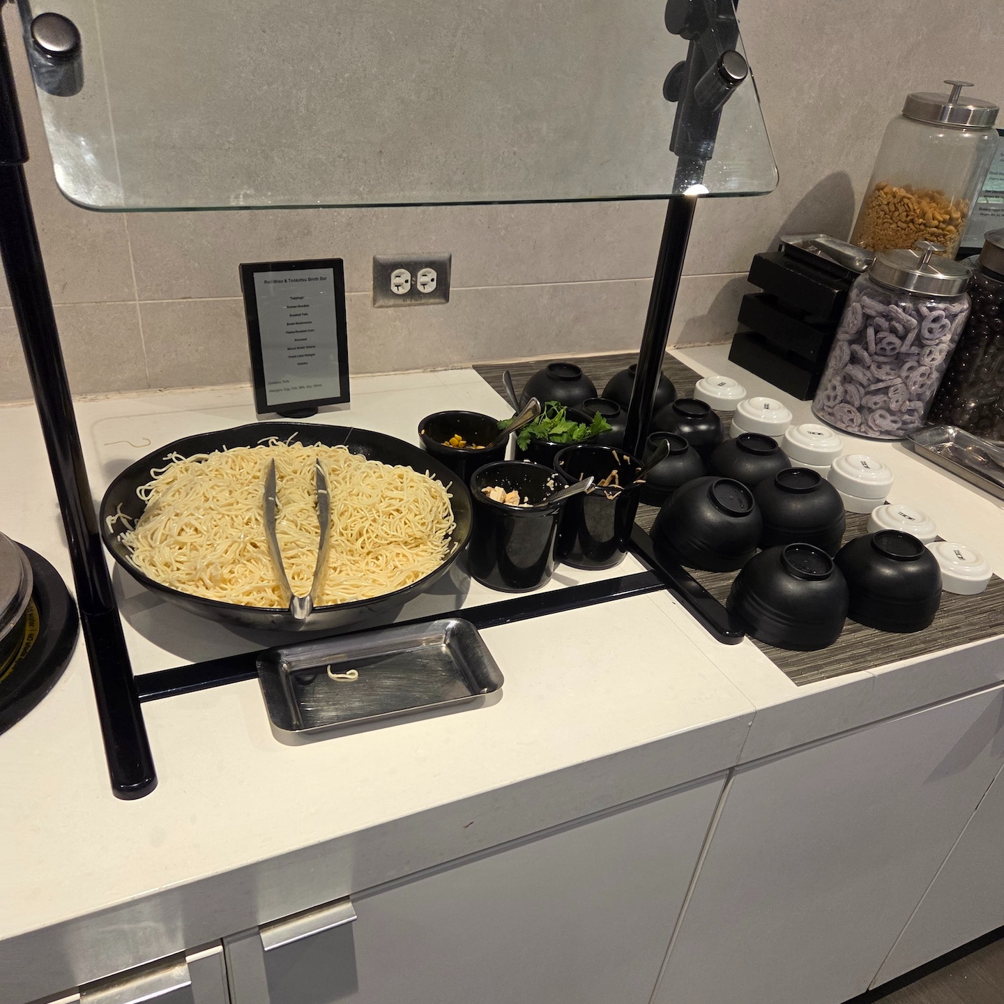 댈러스 포트워스 공항 아메리칸 항공 플래그십 라운지 조식 메뉴 댈러스 포트워스 국제공항의 아메리칸 항공 플래그십 라운지에서는 오전 10시 30분 정도까지는 아침 메뉴가 제공되고, 그 이후에는 점심/저녁 메뉴가 제공됩니다. 아침 시간에는 기본적인 미국식 아침 식사 메뉴인 소시지, 베이컨, 해쉬브라운, 프렌치토스트 등의 메뉴 이외에도 샐러드류와 훈제 연어, 간단한 수준의 캘리포니아 롤이 제공됩니다. 수프류와 더불어 일본식 된장국인 미소국, 누들바에서는 국물이 있는 국수 요리도 제공되는데 이는 아마도 오전 시간대에는 댈러스 포트워스 공항에서 출발하는 아시아노선이 많기 때문인 것 같습니다.