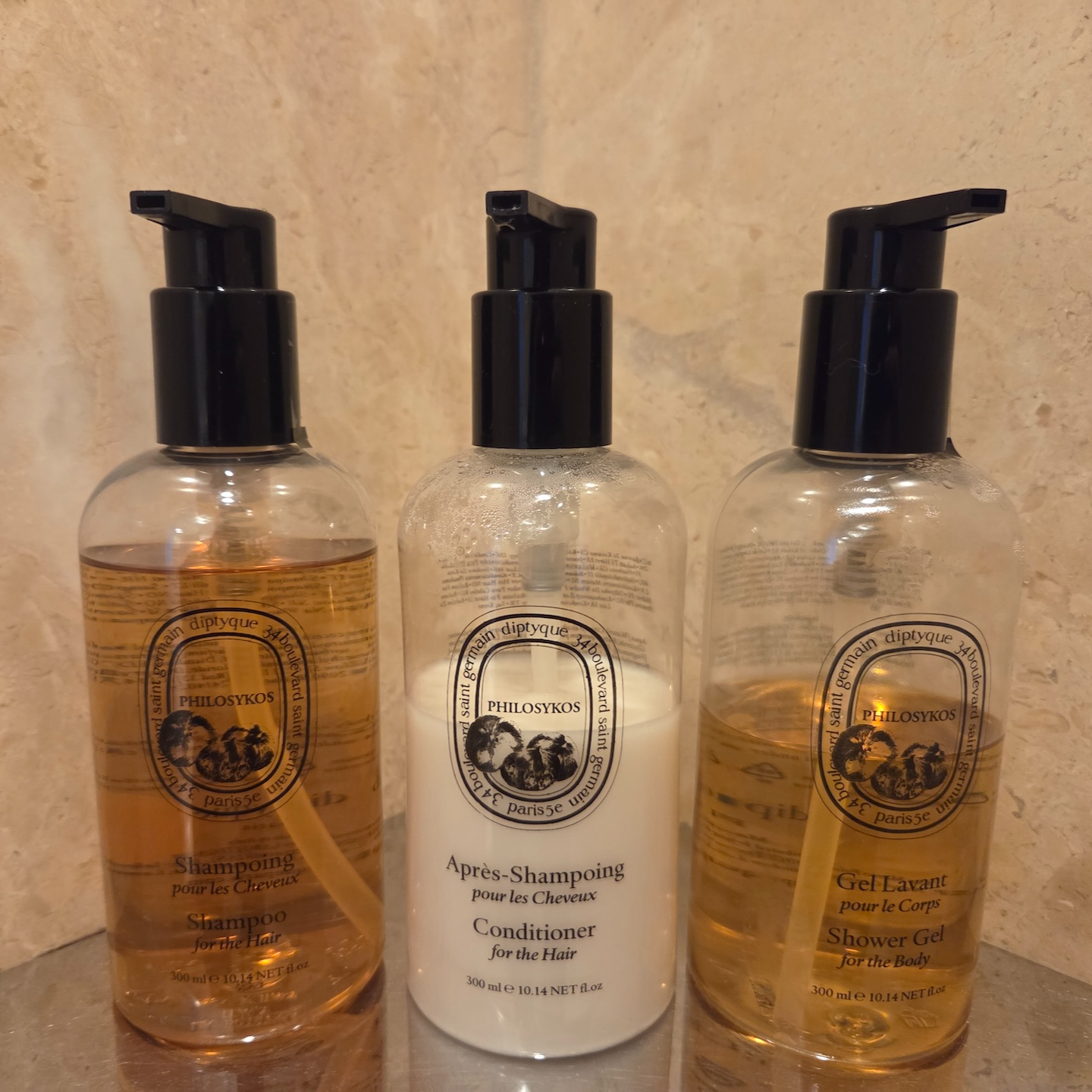 더 리츠 칼튼 보스턴은 욕실 어매니티로 Diptyque의 필로시코스(Philosykos) 라인을 사용하고 있습니다. 메인 욕실에는 샴푸, 컨디셔너, 샤워젤, 핸드 & 바디 로션이 대용량으로 비치되어 있었고, 핸드워시 대신 동일 라인의 비누가 세면대, 욕조, 그리고 게스트 화장실에 각각 준비되어 있었습니다. 필로시코스 라인의 향은 전반적으로 우디한 베이스에 과일 향이 더해진 느낌이었고, 바디 로션은 여기에 밀키한 느낌까지 더해진 향이었습니다. 다만 향 자체가 꽤 개성이 있는 편이라, 개인적으로는 호불호가 갈릴 수 있겠다는 인상을 받았습니다.
