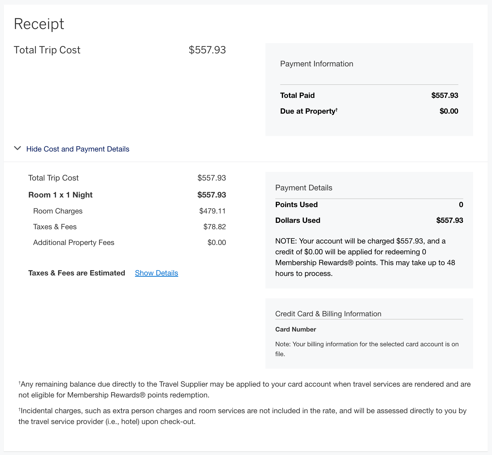 더 리츠 칼튼 보스턴 예약내역 (c) americanexpress.com 이번 숙박은 메리어트 공식 홈페이지가 아닌 아메리칸 익스프레스 FHR(Fine Hotels + Resorts) 프로그램을 통해 예약했습니다. 일반적으로 FHR은 다양한 혜택이 포함되는 대신 공식 홈페이지보다 가격이 소폭 높은 경우가 많지만, 제가 방문한 시기는 비수기였기 때문에 가격 차이는 크지 않았습니다. 예약은 가장 기본 객실인 테라스 뷰 1킹 게스트룸으로 진행했고, 객실 요금 $479.11에 세금 및 수수료 $78.82가 추가되어 총 $557.93을 지불했습니다.