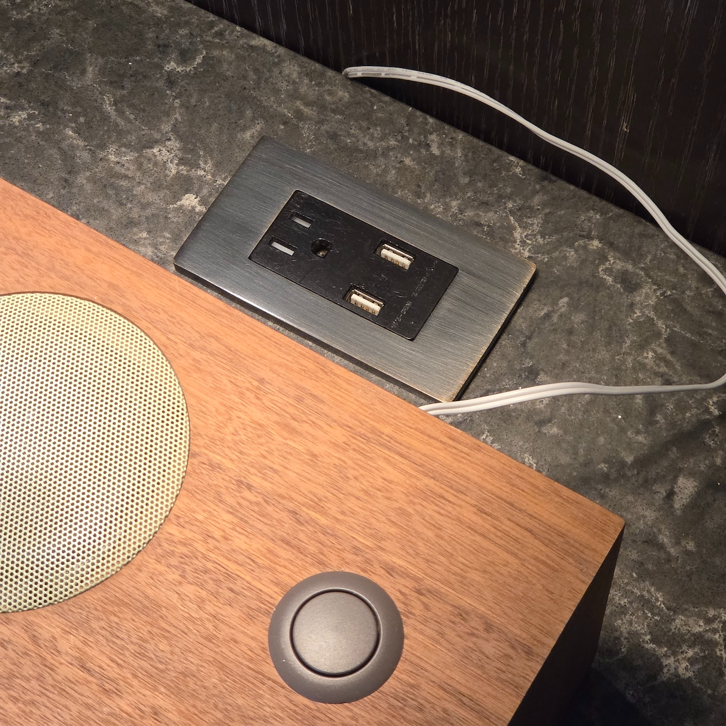 더 리츠 칼튼 보스턴 럭셔리 스위트 객실 침실 사이드 테이블 거실과 다이닝 공간 사이, 창 반대편에는 침실로 연결되는 문이 있습니다. 침실 중앙에는 킹 사이즈 침대가 놓여 있고, 양쪽에는 사이드 테이블과 조명, 독서등이 배치되어 있습니다. 한쪽에는 전화기와 메모패드, 다른 쪽에는 라디오 겸 블루투스 스피커 및 알람 시계가 놓여 있었으며, 양쪽 모두 콘센트와 USB 포트가 함께 제공되었습니다.