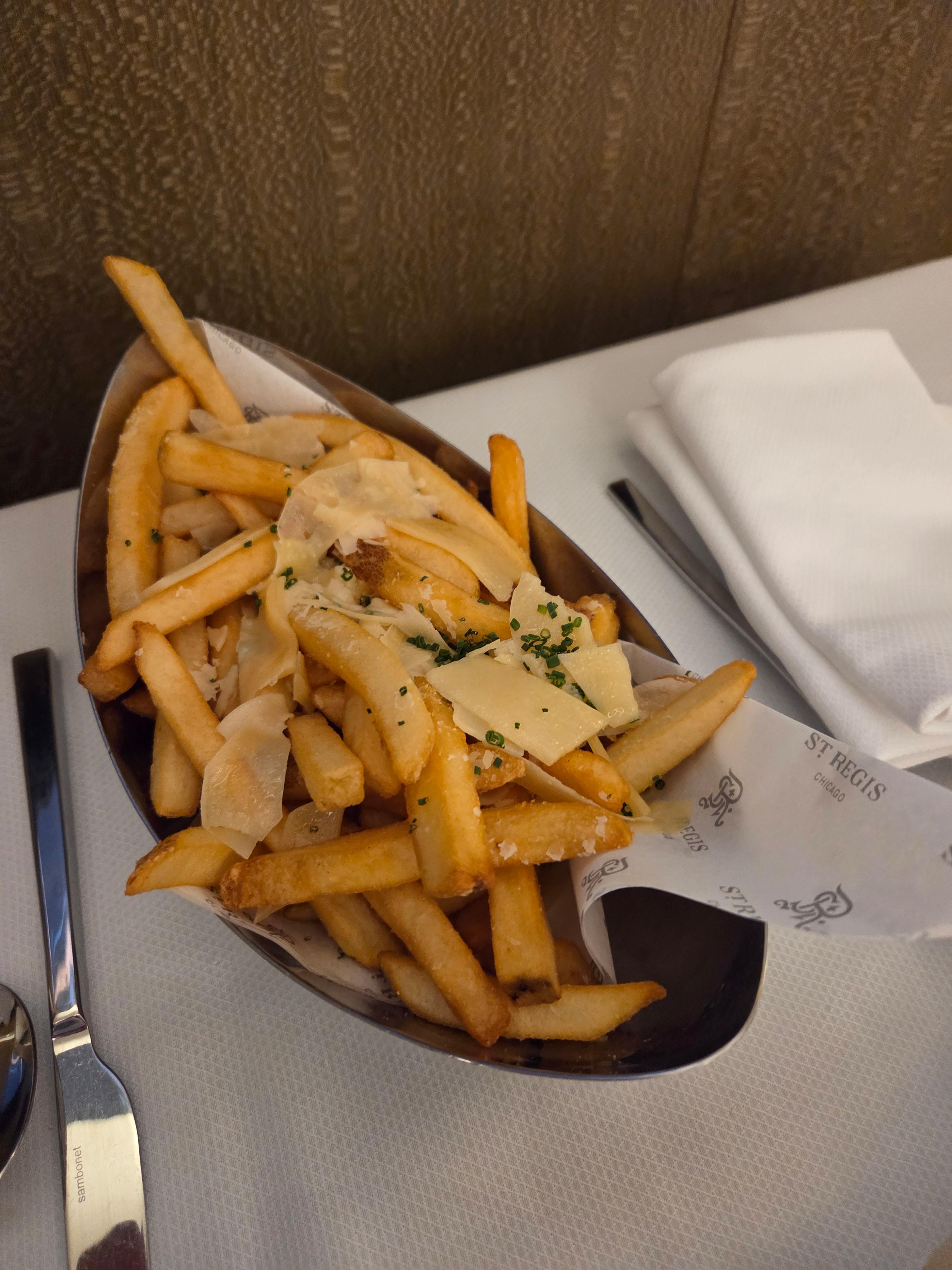 세인트 레지스 시카고 프라이빗 다이닝 메뉴 2 세인트 레지스 시카고에서 인룸 다이닝도 이용했습니다. 세인트 레지스 시카고에서는 인룸다이닝이나 룸서비스라는 이름이 아닌 프라이빗 다이닝이란 이름으로 해당 서비스를 제공합니다. 저는 가볍게 먹을 메뉴 몇 개를 시켜봤습니다. 가장 먼저 왕연어 & 트러플 크루도를 시켰는데요, 크루도는 날것이라는 이탈리아어로 왕연어 & 트러플 크루도는 연어회에 블랙 트러플, 건조 미소, 유자 올리브유 등을 곁들여 먹는 음식이었습니다. 이 음식이 꽤나 맛있었는데요, 연어 특유의 향이 건조 미소의 약간은 은은하면서도 쿰쿰한 맛과 잘 어우러졌고, 쪽파가 쿰쿰한 맛이 과하지 않게 잡아주고 마지막에 유자 올리브유의 상큼함으로 입을 가시는 느낌이었습니다. 다만, 블랙 트러플의 맛이나 향이 거의 나지 않는다는 점은 아쉬웠습니다. 그다음으로는 트러플 감자튀김을 먹었는데요, 약간은 포슬포슬한 느낌의 감자튀김으로 트러플향과 마지막에 올라간 치즈의 맛이 잘 어울렸습니다. 거기에 케첩은 단맛보다는 산미가 강조되는 맛으로 케첩을 찍어먹으면 케첩의 상큼함이 밸런스를 잘 잡아주는 맛이었습니다. 다만, 아무래도 인룸 다이닝이다 보니 감자튀김이 조금은 눅눅했다는 점이 아쉬웠습니다. 타이거 쉬림프의 경우 익힘 정도가 아주 좋아서 탱글 하면서도 새우 특유의 갑각류 감칠맛과 단맛이 잘 느껴졌습니다. 같이 온 칵테일소스도 단맛보다는 신맛과 매콤함이 두드려지는 맛이어서 새우와 잘 어울렸습니다. 시트러스 크렘 브륄레의 경우 시트러스의 맛이 상큼해서 질리지 않게 들어갈 수 있는 크렘 브륄레였고, 계란의 맛이 풍부하고 바닐라의 맛 또한 인위적이지 않은 자연스러운 맛이었습니다. 물론 위의 설탕 코팅도 바삭해서 식감을 더해주어서 좋았고요. 마지막으로는 바닐라 아이스크림을 먹었는데요, VERO라는 시카고 지역에 있는 아이스크림 가게인데 바닐라 향이 부담스럽지 않으면서도 단맛과 밸런스가 좋아서 제가 먹었던 바닐라 아이스크림 중에 참 맛있었던 바닐라 아이스크림 중 하나였습니다. 다만, 아무래도 아이스크림의 경우 디저트로 먹는 경우가 많은데 얼음이나 그런 방법 없이 종이용기에 담긴 아이스크림 하나만 달랑 나와 빨리 녹았다는 점이 아쉬웠습니다.
